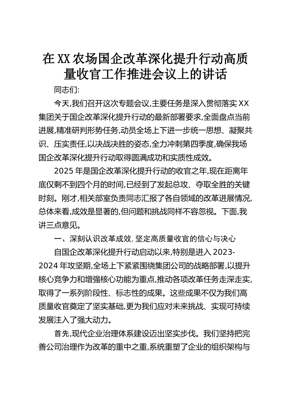 在XX農(nóng)場國企改革深化提升行動高質(zhì)量收官工作推進會議上的講話