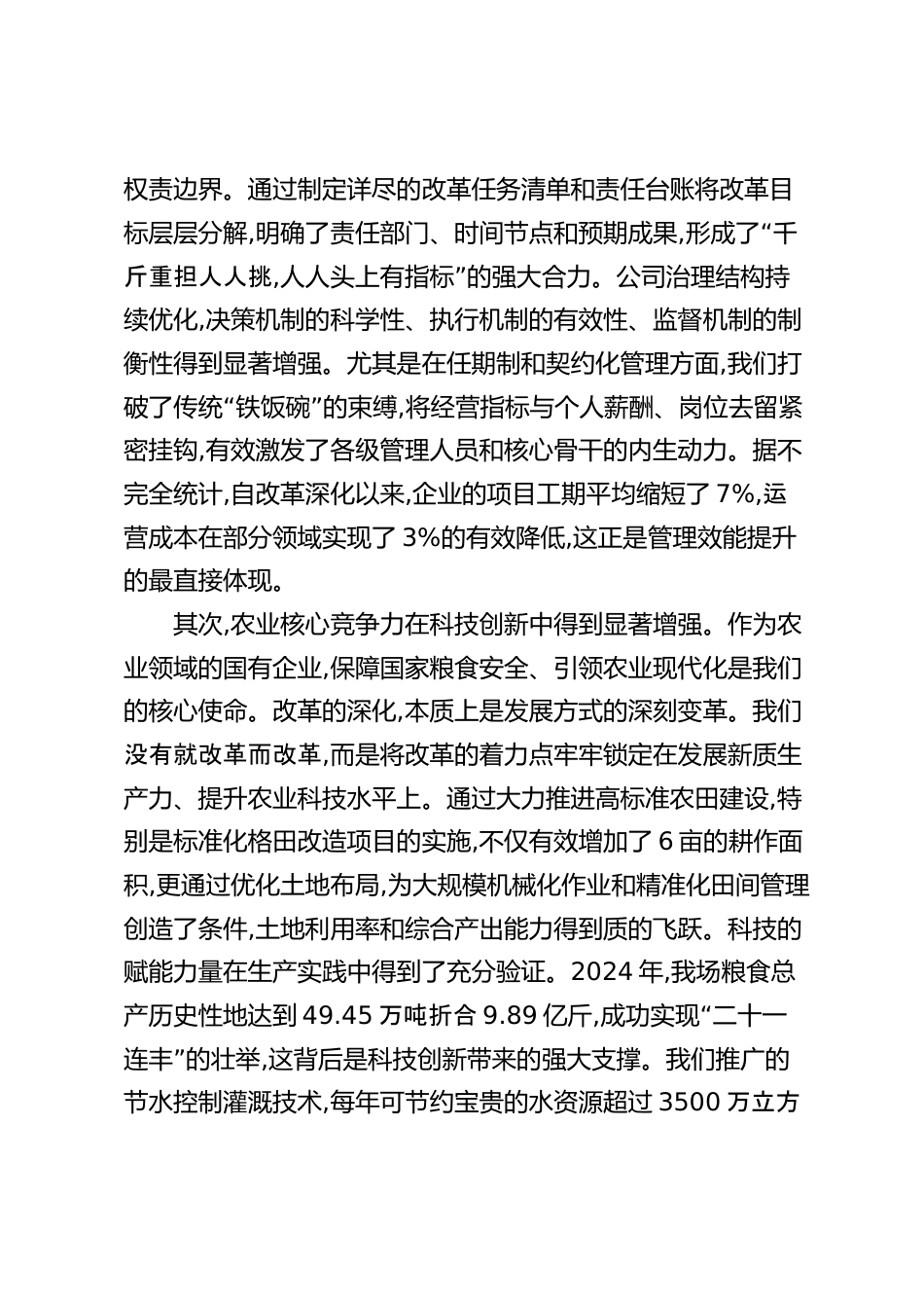在XX農(nóng)場國企改革深化提升行動高質(zhì)量收官工作推進會議上的講話同志們:今天,我們召開這次專題會議,主要任務是深入貫徹落實XX集團關(guān)于國企改革深化提升行動的最新部署要求,全面盤點當前進展,精準研判形勢任務,動員全場上下進一步統(tǒng)一思想、凝聚共識、壓實責任,以決戰(zhàn)決勝的姿態(tài),全力沖刺第四季度,確保我場國企改革深化提升行動取得圓滿成功和實質(zhì)性成效。2025年是國企改革深化提升行動的收官之年,現(xiàn)在距離年底僅剩不到四個月的時間,已經(jīng)到了發(fā)起總攻、奪取全勝的關(guān)鍵時刻。剛才,相關(guān)部室負責同志匯報了各自領(lǐng)域的改革進展情況,總體來看,成效是顯著的,但問題和挑戰(zhàn)同樣不容...