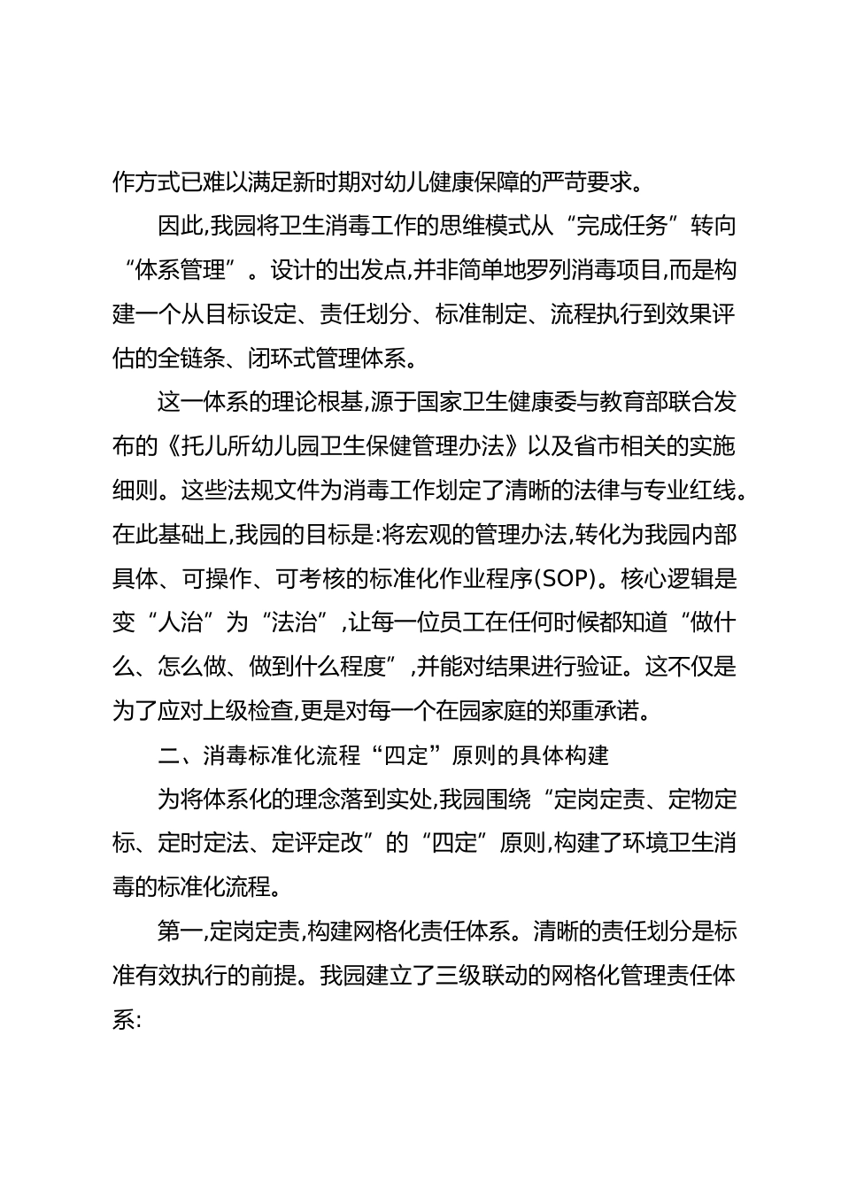 在XX省XX市幼兒園環(huán)境衛(wèi)生消毒標(biāo)準(zhǔn)化流程交流座談會(huì)上的經(jīng)驗(yàn)交流發(fā)言(精品)尊敬的各位領(lǐng)導(dǎo)、各位園長同仁:大家上午好!我是XX縣實(shí)驗(yàn)幼兒園的XX。非常榮幸能有這樣一個(gè)寶貴的機(jī)會(huì),與在座的各位學(xué)前教育界的專家和同仁們,一同探討幼兒園環(huán)境衛(wèi)生消毒這一至關(guān)重要的議題。與其說是經(jīng)驗(yàn)交流,我更愿意將其視為一次向各位先進(jìn)園所學(xué)習(xí)、共同提升的匯報(bào)與思考。幼兒的健康與安全是幼兒園一切工作的基石,衛(wèi)生消毒工作則是守護(hù)這塊基石最堅(jiān)實(shí)、最細(xì)致的防線。今天,我將圍繞“幼兒園環(huán)境衛(wèi)生消毒標(biāo)準(zhǔn)化流程的設(shè)計(jì)與實(shí)施效果”這一主題,結(jié)合我園近年來的探索與實(shí)踐,分享一些粗淺的...