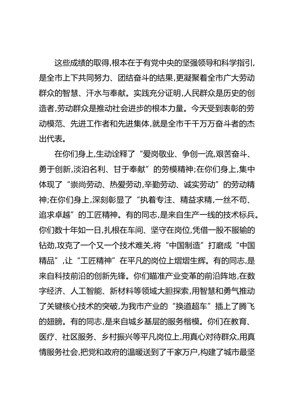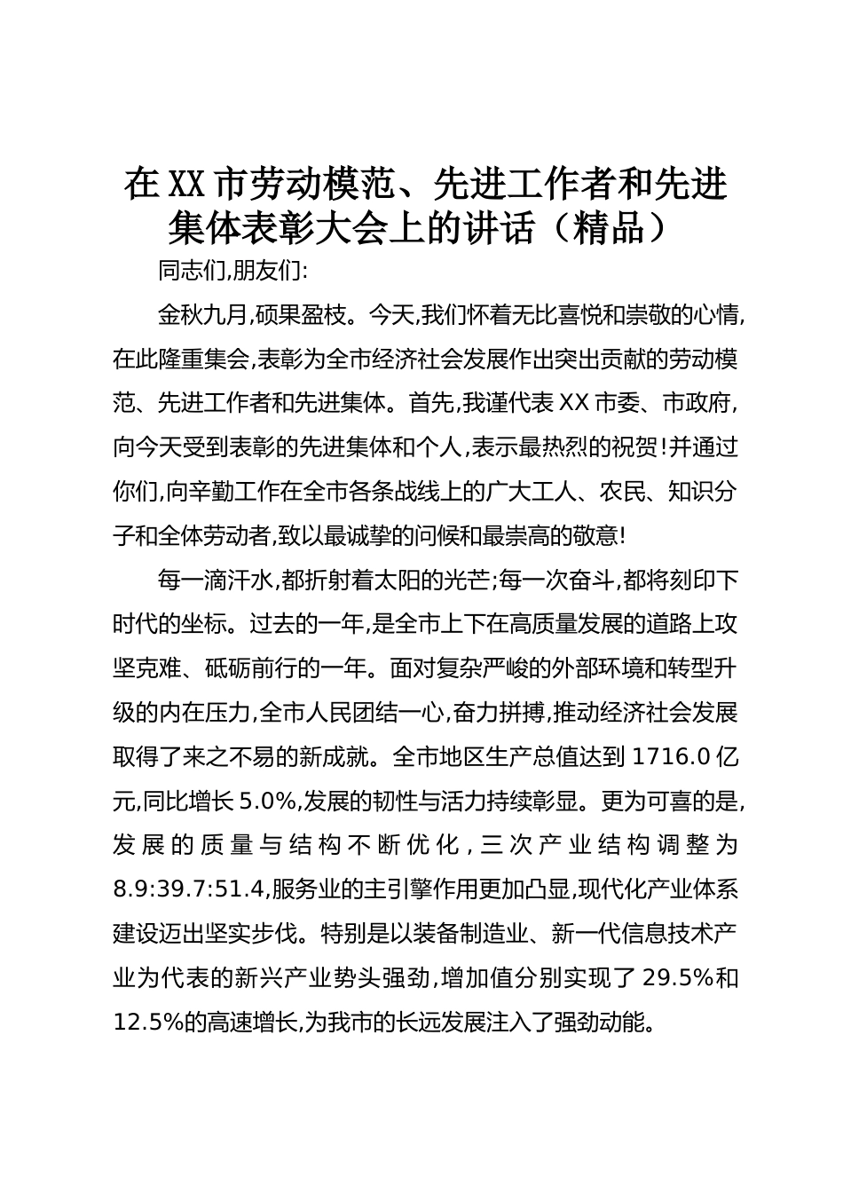 在XX市勞動模范、先進(jìn)工作者和先進(jìn)集體表彰大會上的講話(精品)同志們,朋友們:金秋九月,碩果盈枝。今天,我們懷著無比喜悅和崇敬的心情,在此隆重集會,表彰為全市經(jīng)濟(jì)社會發(fā)展作出突出貢獻(xiàn)的勞動模范、先進(jìn)工作者和先進(jìn)集體。首先,我謹(jǐn)代表XX市委、市政府,向今天受到表彰的先進(jìn)集體和個人,表示最熱烈的祝賀!并通過你們,向辛勤工作在全市各條戰(zhàn)線上的廣大工人、農(nóng)民、知識分子和全體勞動者,致以最誠摯的問候和最崇高的敬意!每一滴汗水,都折射著太陽的光芒;每一次奮斗,都將刻印下時代的坐標(biāo)。過去的一年,是全市上下在高質(zhì)量發(fā)展的道路上攻堅克難、砥礪前行的一年。面對復(fù)雜...
