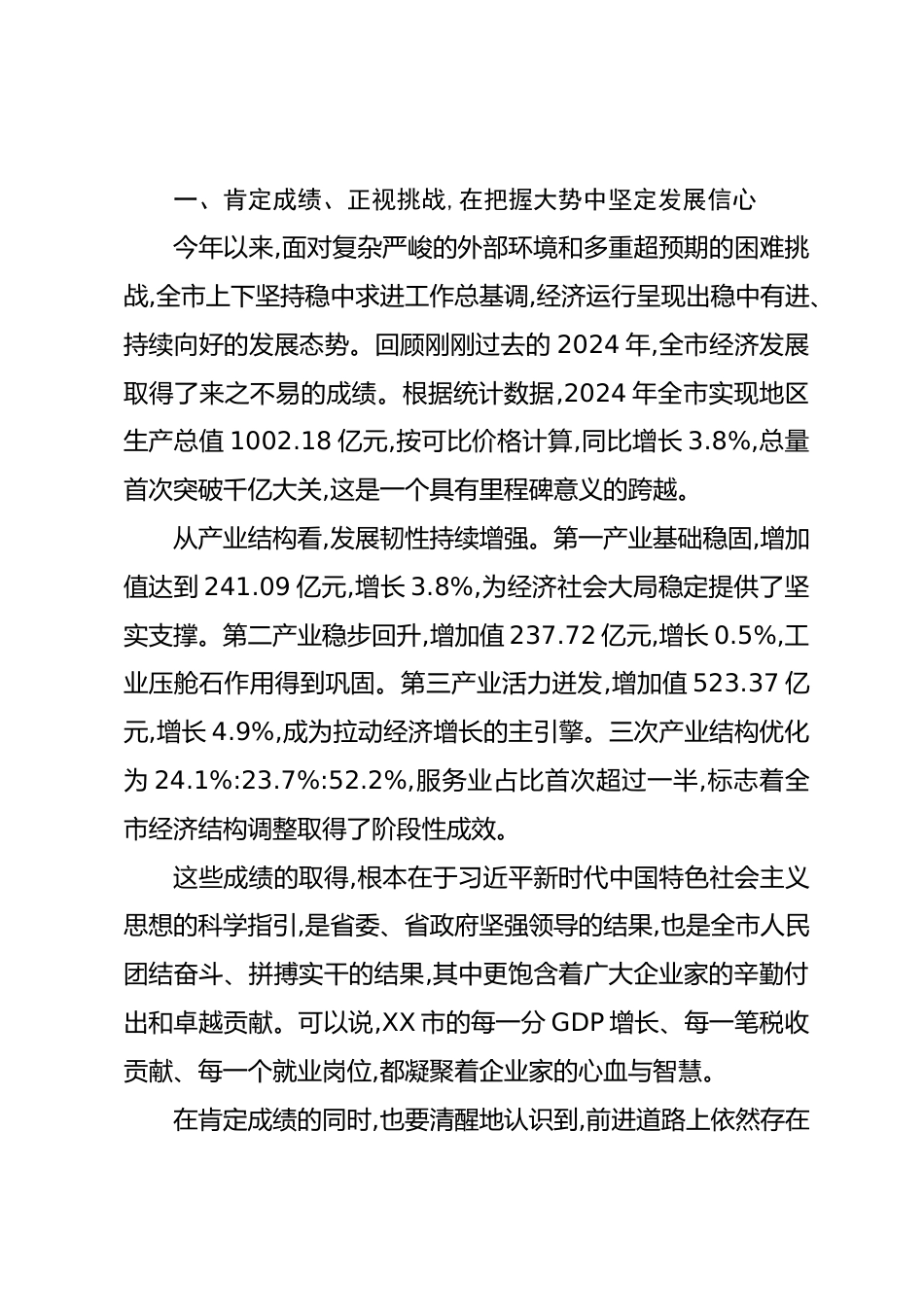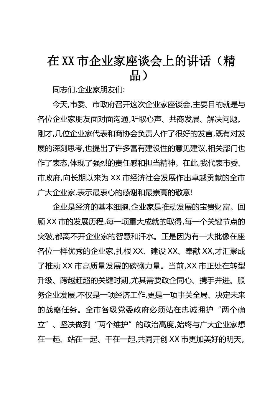 在XX市企業(yè)家座談會上的講話(精品)同志們,企業(yè)家朋友們:今天,市委、市政府召開這次企業(yè)家座談會,主要目的就是與各位企業(yè)家朋友面對面溝通,聽取心聲、共商發(fā)展、解決問題。剛才,幾位企業(yè)家代表和商協(xié)會負責人作了很好的發(fā)言,既有對發(fā)展的深刻思考,也提出了許多富有建設(shè)性的意見建議,相關(guān)部門也作了表態(tài),體現(xiàn)了強烈的責任感和擔當精神。在此,我代表市委、市政府,向長期以來為XX市經(jīng)濟社會發(fā)展作出卓越貢獻的全市廣大企業(yè)家,表示最衷心的感謝和最崇高的敬意!企業(yè)是經(jīng)濟的基本細胞,企業(yè)家是推動發(fā)展的寶貴財富?;仡橷X市的發(fā)展歷程,每一項重大成就的取得,每一個關(guān)鍵節(jié)點的...