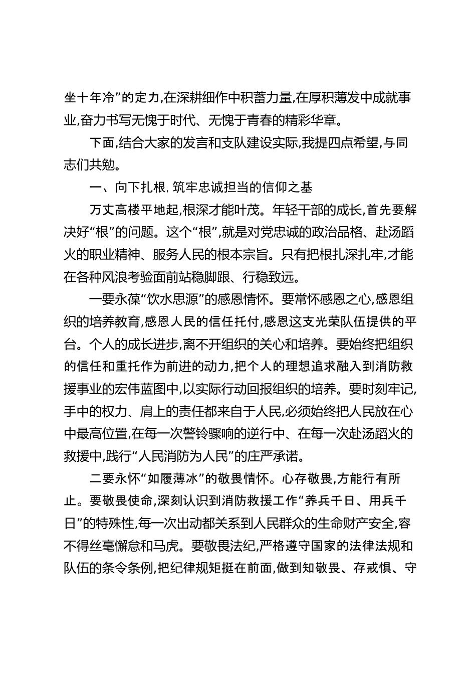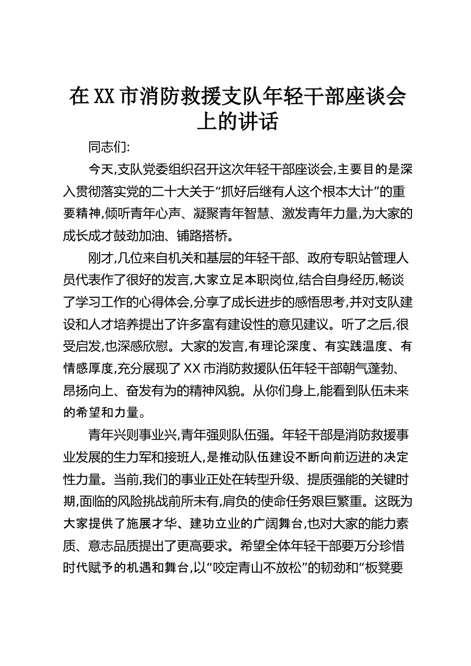 在XX市消防救援支隊年輕干部座談會上的講話同志們:今天,支隊黨委組織召開這次年輕干部座談會,主要目的是深“”入貫徹落實黨的二十大關于抓好后繼有人這個根本大計的重要精神,傾聽青年心聲、凝聚青年智慧、激發(fā)青年力量,為大家的成長成才鼓勁加油、鋪路搭橋。剛才,幾位來自機關和基層的年輕干部、政府專職站管理人員代表作了很好的發(fā)言,大家立足本職崗位,結(jié)合自身經(jīng)歷,暢談了學習工作的心得體會,分享了成長進步的感悟思考,并對支隊建設和人才培養(yǎng)提出了許多富有建設性的意見建議。聽了之后,很受啟發(fā),也深感欣慰。大家的發(fā)言,有理深度、有踐溫度、有論實情感厚度,充分展現(xiàn)...