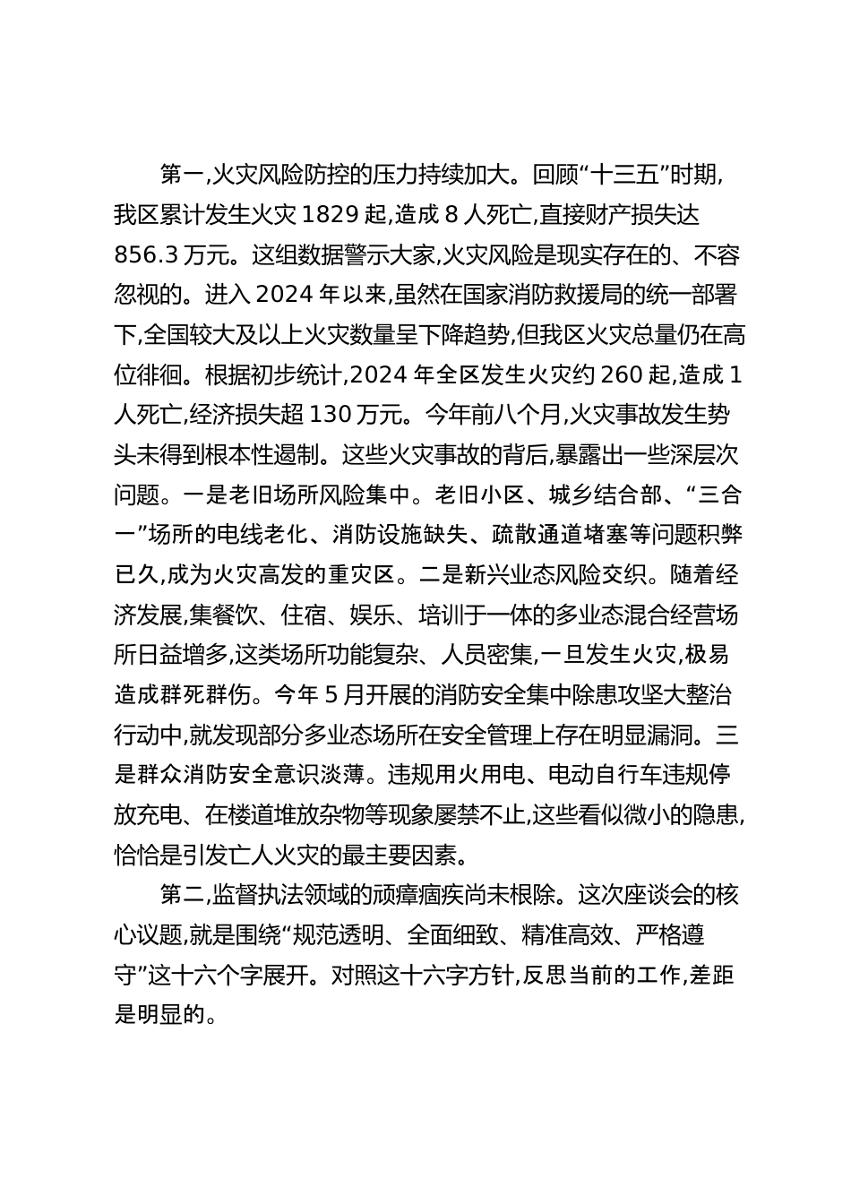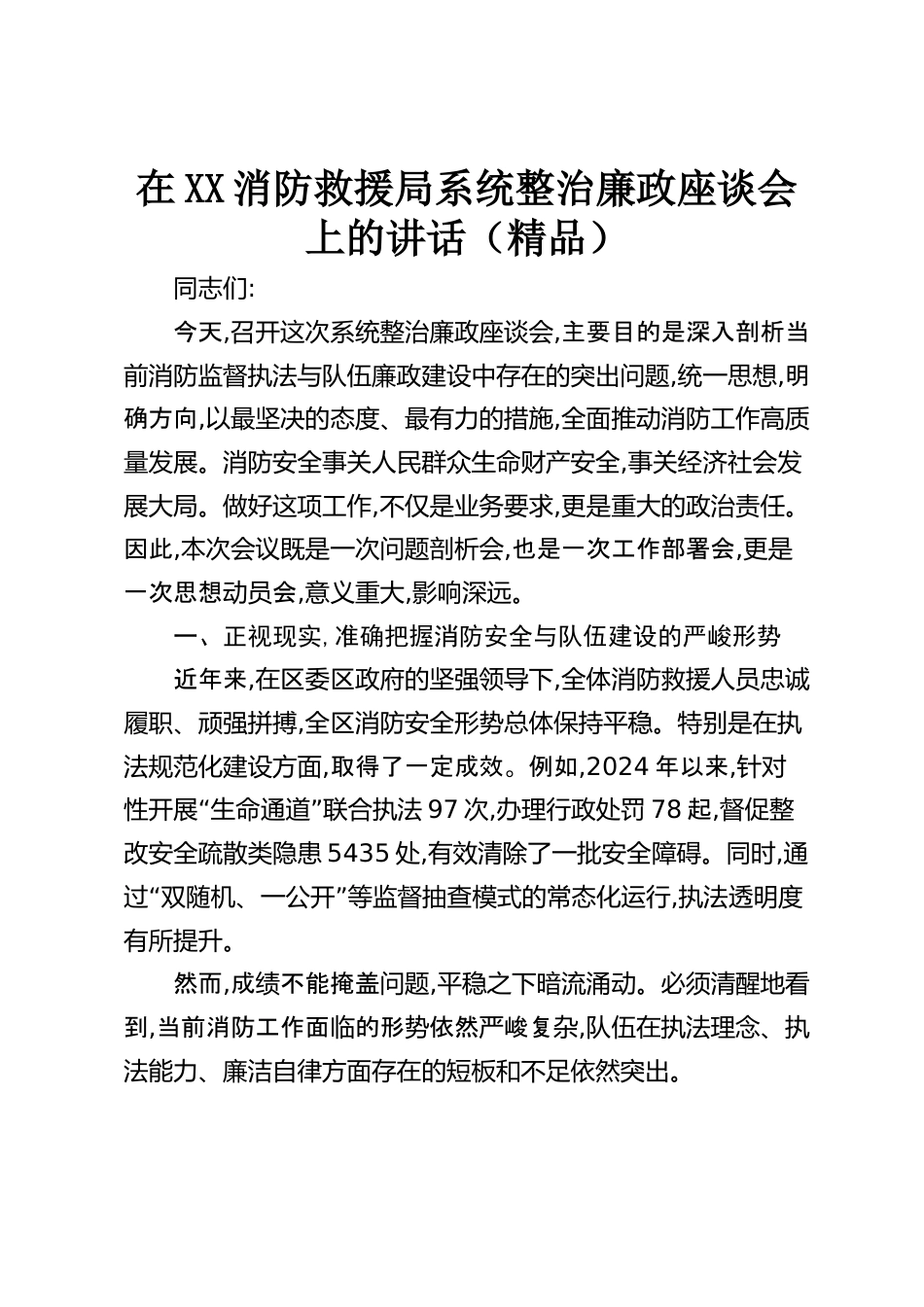 在XX消防救援局系統(tǒng)整治廉政座談會上的講話(精品)同志們:今天,召開這次系統(tǒng)整治廉政座談會,主要目的是深入剖析當(dāng)前消防監(jiān)督執(zhí)法與隊(duì)伍廉政建設(shè)中存在的突出問題,統(tǒng)一思想,明確方向,以最堅(jiān)決的態(tài)度、最有力的措施,全面推動消防工作高質(zhì)量發(fā)展。消防安全事關(guān)人民群眾生命財(cái)產(chǎn)安全,事關(guān)經(jīng)濟(jì)社會發(fā)展大局。做好這項(xiàng)工作,不僅是業(yè)務(wù)要求,更是重大的政治責(zé)任。因此,本次會議既是一次問題剖析會,也是一次工作部署會,更是一次思想動員會,意義重大,影響深遠(yuǎn)。一、正視現(xiàn)實(shí),準(zhǔn)確把握消防安全與隊(duì)伍建設(shè)的嚴(yán)峻形勢近年來,在區(qū)委區(qū)政府的堅(jiān)強(qiáng)領(lǐng)導(dǎo)下,全體消防救援人員忠誠履職、頑強(qiáng)...