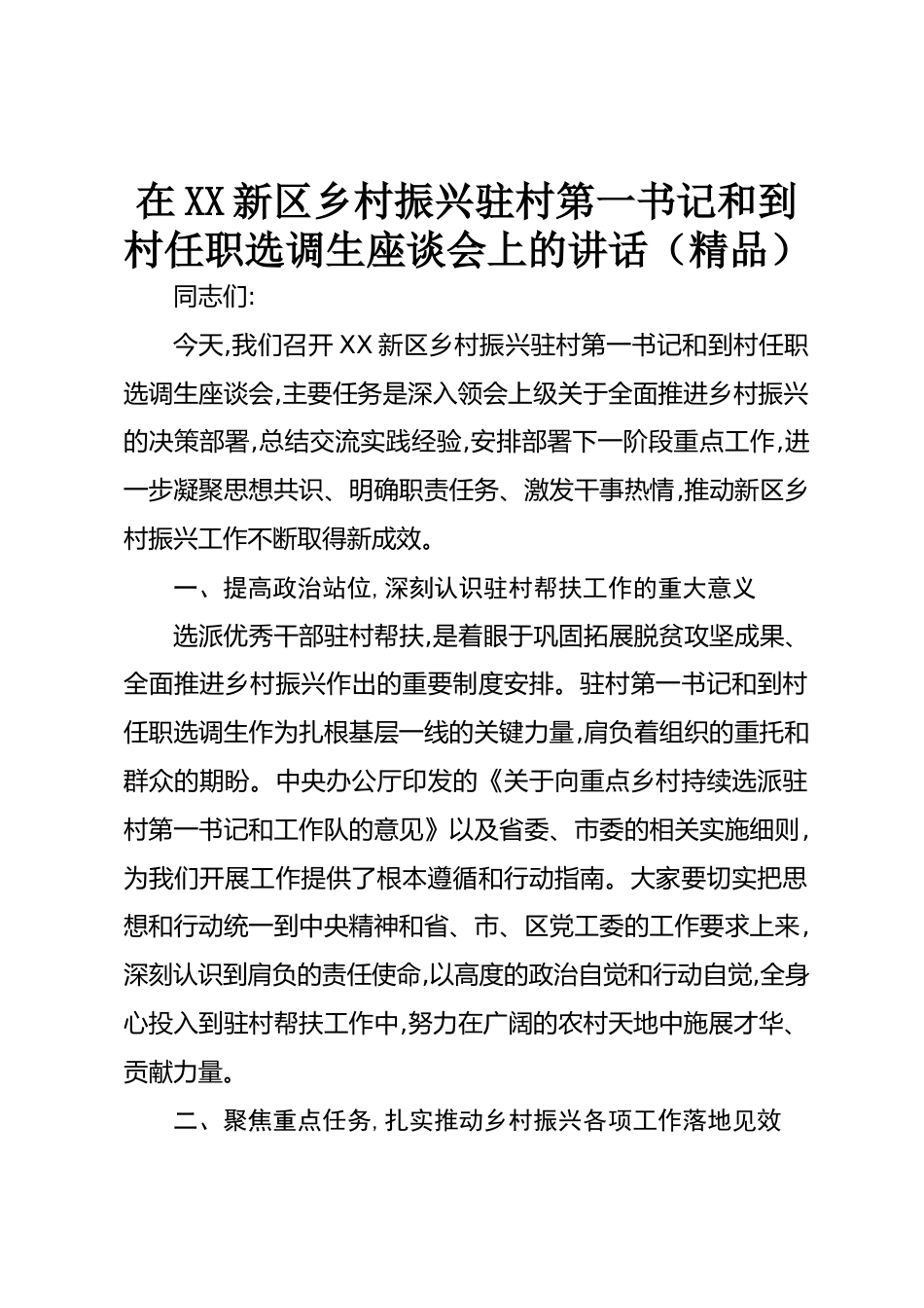 在XX新區(qū)鄉(xiāng)村振興駐村第一書記和到村任職選調(diào)生座談會(huì)上的講話(精品)同志們:今天,我們召開XX新區(qū)鄉(xiāng)村振興駐村第一書記和到村任職選調(diào)生座談會(huì),主要任務(wù)是深入領(lǐng)會(huì)上級(jí)關(guān)于全面推進(jìn)鄉(xiāng)村振興的決策部署,總結(jié)交流實(shí)踐經(jīng)驗(yàn),安排部署下一階段重點(diǎn)工作,進(jìn)一步凝聚思想共識(shí)、明確職責(zé)任務(wù)、激發(fā)干事熱情,推動(dòng)新區(qū)鄉(xiāng)村振興工作不斷取得新成效。一、提高政治站位,深刻認(rèn)識(shí)駐村幫扶工作的重大意義選派優(yōu)秀干部駐村幫扶,是著眼于鞏固拓展脫貧攻堅(jiān)成果、全面推進(jìn)鄉(xiāng)村振興作出的重要制度安排。駐村第一書記和到村任職選調(diào)生作為扎根基層一線的關(guān)鍵力量,肩負(fù)著組織的重托和群眾的期盼...