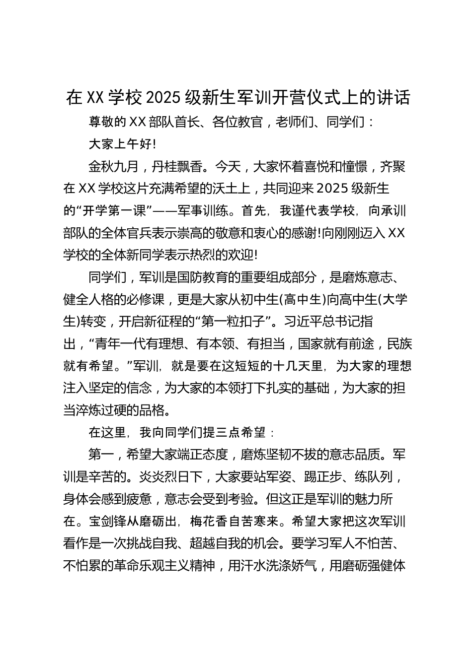 在XX學(xué)校2025級新生軍訓(xùn)開營儀式上的講話尊敬的XX部隊首長、各位教官,老師們、同學(xué)們:大家上午好!金秋九月,丹桂飄香。今天,大家懷著喜悅和憧憬,齊聚在XX學(xué)校這片充滿希望的沃土上,共同迎來2025級新生“”——的開學(xué)第一事。首先,我代表學(xué)校,向承課軍訓(xùn)練謹(jǐn)訓(xùn)部隊的全體官兵表示崇高的敬意和衷心的感謝!向剛剛邁入XX學(xué)校的全體新同學(xué)表示熱烈的歡迎!同學(xué)們,軍訓(xùn)是國防教育的重要組成部分,是磨煉意志、健全人格的必修課,更是大家從初中生(高中生)向高中生(大學(xué)生)“”轉(zhuǎn)變,開啟新征程的第一粒扣子。習(xí)近平總書記指“出,青年一代有理想、有本領(lǐng)、有擔(dān)當(dāng),國家...