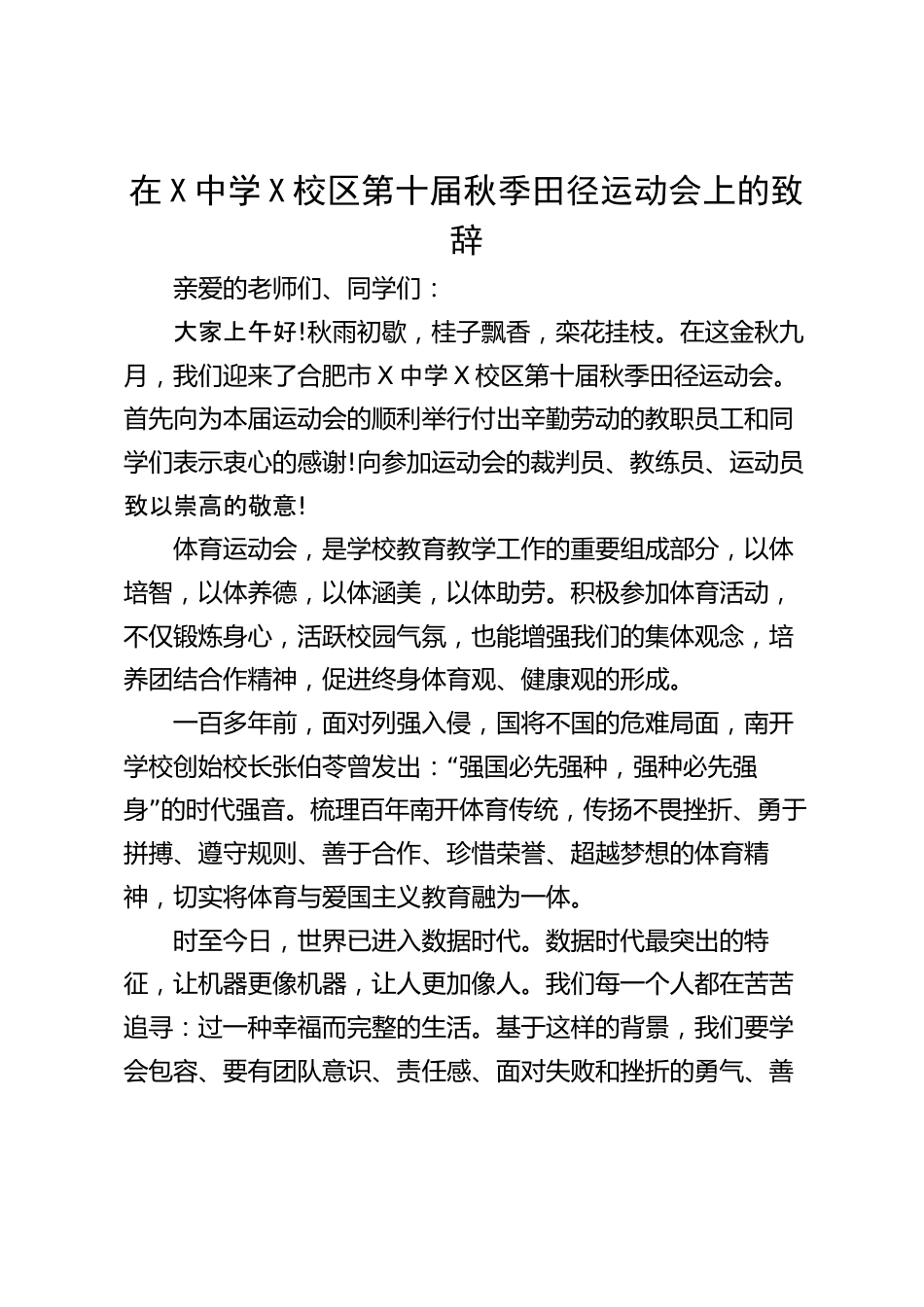 在X中學(xué)X校區(qū)第十屆秋季田徑運(yùn)動(dòng)會(huì)上的致辭親愛(ài)的老師們、同學(xué)們:大家上午好!秋雨初歇,桂子飄香,欒花掛枝。在這金秋九月,我們迎來(lái)了合肥市X中學(xué)X校區(qū)第十屆秋季田徑運(yùn)動(dòng)會(huì)。首先向?yàn)楸緦眠\(yùn)動(dòng)會(huì)的順利舉行付出辛勤勞動(dòng)的教職員工和同學(xué)們表示衷心的感謝!向參加運(yùn)動(dòng)會(huì)的裁判員、教練員、運(yùn)動(dòng)員致以崇高的敬意!體育運(yùn)動(dòng)會(huì),是學(xué)校教育教學(xué)工作的重要組成部分,以體培智,以體養(yǎng)德,以體涵美,以體助勞。積極參加體育活動(dòng),不僅鍛煉身心,活躍校園氣氛,也能增強(qiáng)我們的集體觀念,培養(yǎng)團(tuán)結(jié)合作精神,促進(jìn)終身體育觀、健康觀的形成。一百多年前,面對(duì)列強(qiáng)入侵,國(guó)將不國(guó)的...