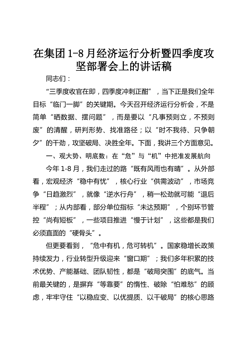在集團(tuán)1-8月經(jīng)濟(jì)運(yùn)行分析暨四季度攻堅(jiān)部署會(huì)上的講話(huà)稿同志們:“三季度收官在即,四季度沖刺正酣”,當(dāng)下正是我們?nèi)昴繕?biāo)“臨門(mén)一腳”的關(guān)鍵期。今天召開(kāi)經(jīng)濟(jì)運(yùn)行分析會(huì),不是簡(jiǎn)單“曬數(shù)據(jù)、擺問(wèn)題”,而是要以“凡事預(yù)則立,不預(yù)則廢”的清醒,研判形勢(shì)、找準(zhǔn)路徑;以“時(shí)不我待、只爭(zhēng)朝夕”的干勁,攻堅(jiān)破局、決勝全年。下面,我講三個(gè)方面意見(jiàn)。一、觀大勢(shì)、明底數(shù):在“?!迸c“機(jī)”中把準(zhǔn)發(fā)展航向今年1-8月,我們走過(guò)的路“既有風(fēng)雨也有晴”。從外部看,宏觀經(jīng)濟(jì)“穩(wěn)中有憂(yōu)”,核心行業(yè)“供需波動(dòng)”,市場(chǎng)競(jìng)爭(zhēng)“日趨激烈”,就像“逆水行舟”,稍一松勁就可能“退...