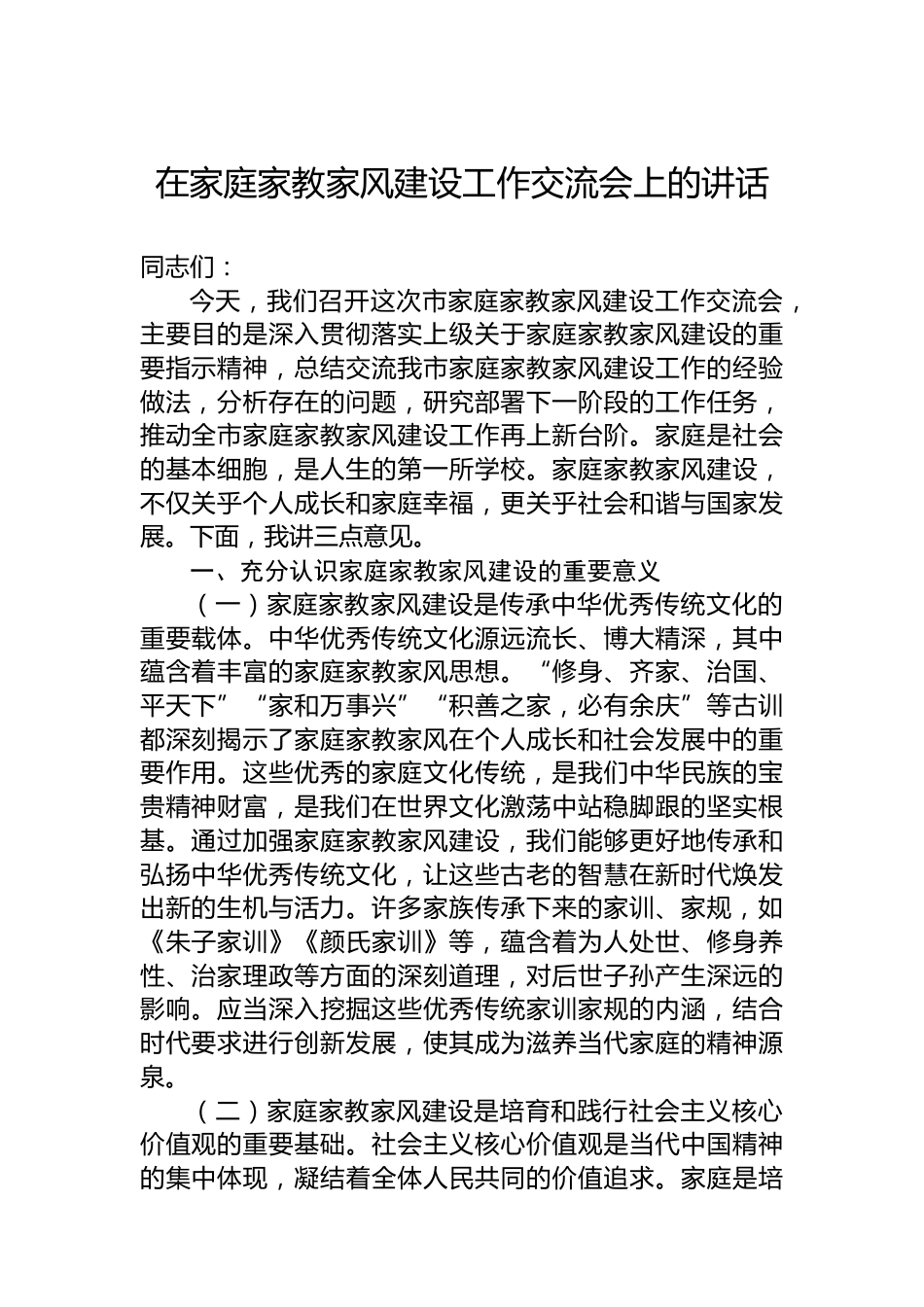 在家庭家教家風(fēng)建設(shè)工作交流會上的講話材料匯編(4篇)