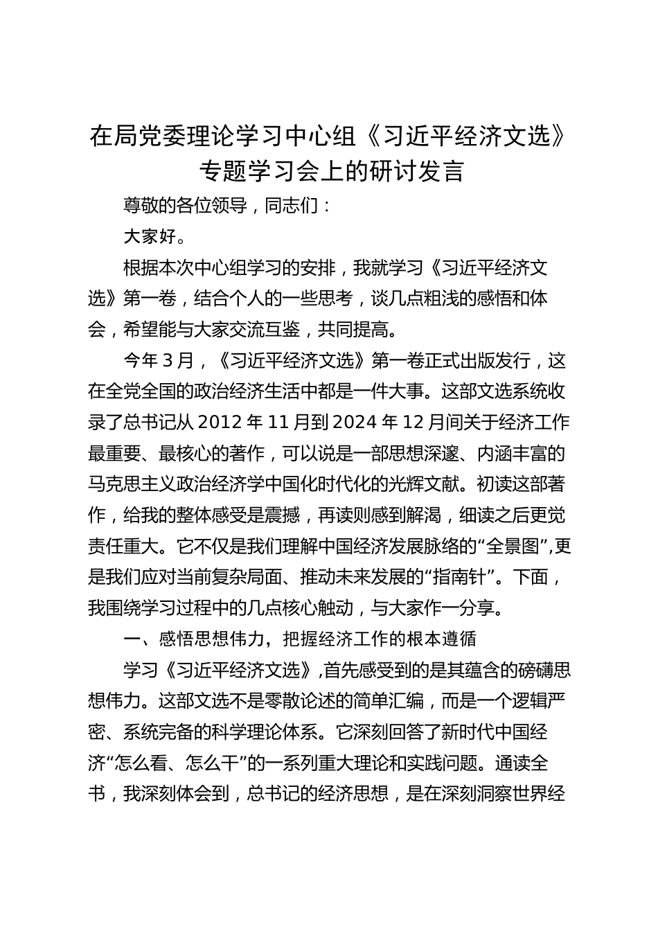 在局黨委理論學(xué)習(xí)中心組《習(xí)近平經(jīng)濟(jì)文選》專題學(xué)習(xí)會上的研討發(fā)言尊敬的各位領(lǐng)導(dǎo),同志們:大家好。根據(jù)本次中心組學(xué)習(xí)的安排,我就學(xué)習(xí)《習(xí)近平經(jīng)濟(jì)文選》第一卷,結(jié)合個人的一些思考,談幾點粗淺的感悟和體會,希望能與大家交流互鑒,共同提高。今年3月,《習(xí)近平經(jīng)濟(jì)文選》第一卷正式出版發(fā)行,這在全黨全國的政治經(jīng)濟(jì)生活中都是一件大事。這部文選系統(tǒng)收錄了總書記從2012年11月到2024年12月間關(guān)于經(jīng)濟(jì)工作最重要、最核心的著作,可以說是一部思想深邃、內(nèi)涵豐富的馬克思主義政治經(jīng)濟(jì)學(xué)中國化時代化的光輝文獻(xiàn)。初讀這部著作,給我的整體感受是震撼,再讀則感到解渴...