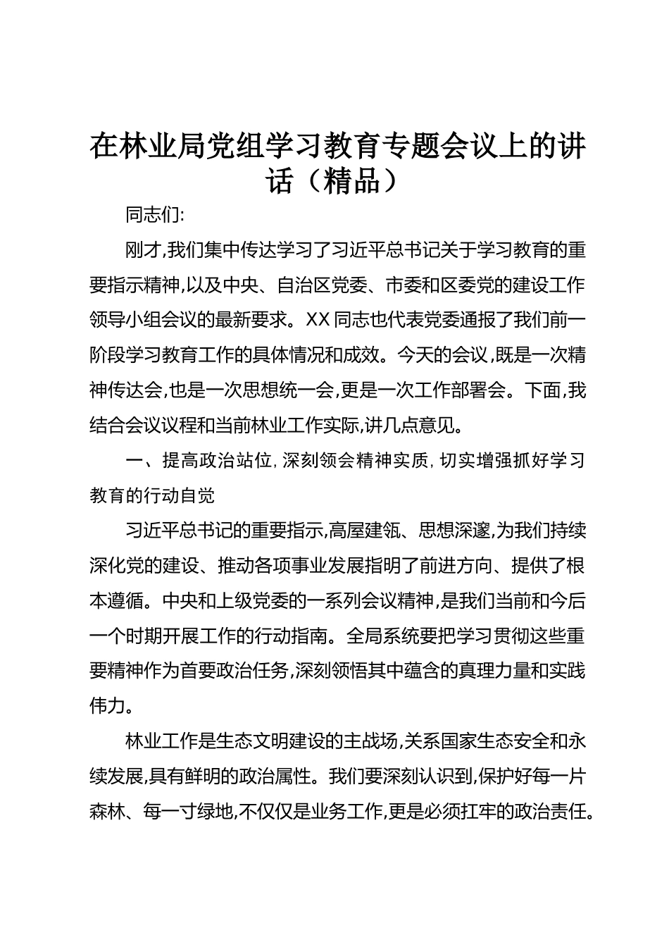 在林業(yè)局黨組學(xué)習(xí)教育專題會(huì)議上的講話(精品)同志們:剛才,我們集中傳達(dá)學(xué)習(xí)了習(xí)近平總書記關(guān)于學(xué)習(xí)教育的重要指示精神,以及中央、自治區(qū)黨委、市委和區(qū)委黨的建設(shè)工作領(lǐng)導(dǎo)小組會(huì)議的最新要求。XX同志也代表黨委通報(bào)了我們前一階段學(xué)習(xí)教育工作的具體情況和成效。今天的會(huì)議,既是一次精神傳達(dá)會(huì),也是一次思想統(tǒng)一會(huì),更是一次工作部署會(huì)。下面,我結(jié)合會(huì)議議程和當(dāng)前林業(yè)工作實(shí)際,講幾點(diǎn)意見。一、提高政治站位,深刻領(lǐng)會(huì)精神實(shí)質(zhì),切實(shí)增強(qiáng)抓好學(xué)習(xí)教育的行動(dòng)自覺習(xí)近平總書記的重要指示,高屋建瓴、思想深邃,為我們持續(xù)深化黨的建設(shè)、推動(dòng)各項(xiàng)事業(yè)發(fā)展指明了前進(jìn)方向、提供...