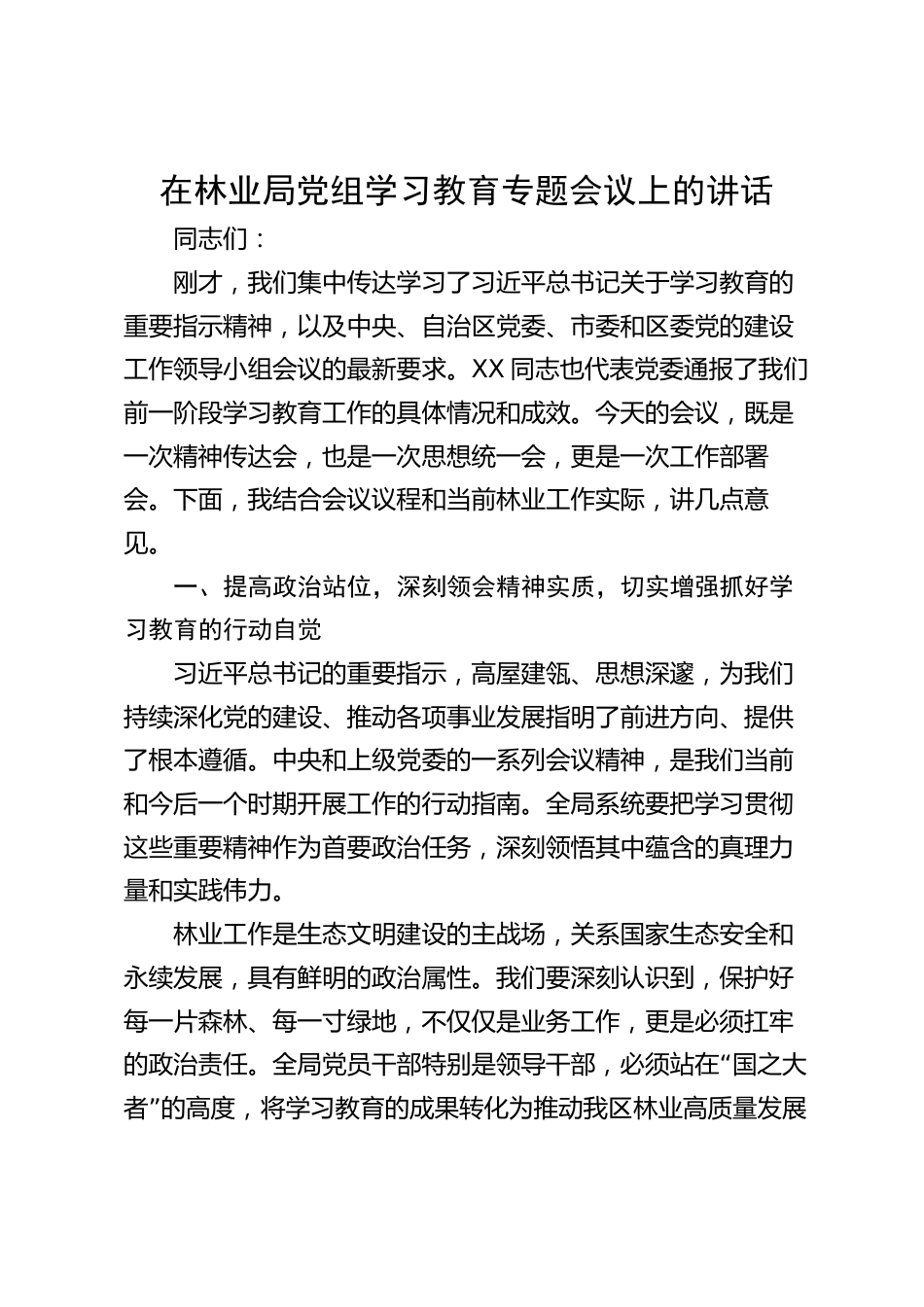 在林業(yè)局黨組學(xué)習(xí)教育專題會議上的講話同志們:剛才,我們集中傳達學(xué)習(xí)了習(xí)近平總書記關(guān)于學(xué)習(xí)教育的重要指示精神,以及中央、自治區(qū)黨委、市委和區(qū)委黨的建設(shè)工作領(lǐng)導(dǎo)小組會議的最新要求。XX同志也代表黨委通報了我們前一階段學(xué)習(xí)教育工作的具體情況和成效。今天的會議,既是一次精神傳達會,也是一次思想統(tǒng)一會,更是一次工作部署會。下面,我結(jié)合會議議程和當(dāng)前林業(yè)工作實際,講幾點意見。一、提高政治站位,深刻領(lǐng)會精神實質(zhì),切實增強抓好學(xué)習(xí)教育的行動自覺習(xí)近平總書記的重要指示,高屋建瓴、思想深邃,為我們持續(xù)深化黨的建設(shè)、推動各項事業(yè)發(fā)展指明了前進方向、...