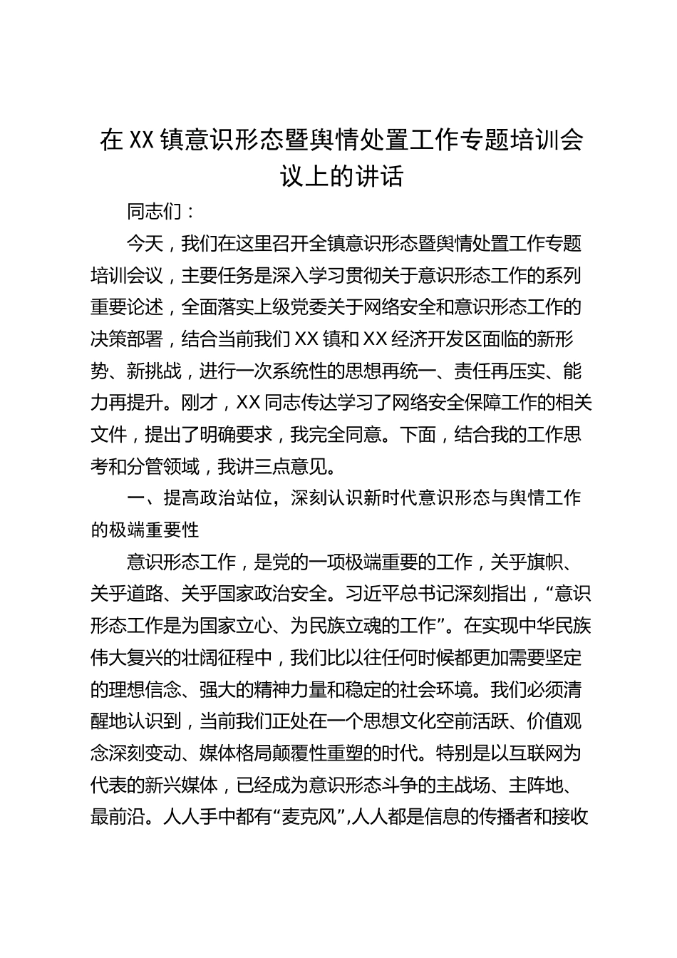 在XX鎮(zhèn)意識形態(tài)暨輿情處置工作專題培訓(xùn)會議上的講話同志們:今天,我們在這里召開全鎮(zhèn)意識形態(tài)暨輿情處置工作專題培訓(xùn)會議,主要任務(wù)是深入學(xué)習(xí)貫徹關(guān)于意識形態(tài)工作的系列重要論述,全面落實上級黨委關(guān)于網(wǎng)絡(luò)安全和意識形態(tài)工作的決策部署,結(jié)合當(dāng)前我們XX鎮(zhèn)和XX經(jīng)濟開發(fā)區(qū)面臨的新形勢、新挑戰(zhàn),進行一次系統(tǒng)性的思想再統(tǒng)一、責(zé)任再壓實、能力再提升。剛才,XX同志傳達學(xué)習(xí)了網(wǎng)絡(luò)安全保障工作的相關(guān)文件,提出了明確要求,我完全同意。下面,結(jié)合我的工作思考和分管領(lǐng)域,我講三點意見。一、提高政治站位,深刻認識新時代意識形態(tài)與輿情工作的極端重要性意識形態(tài)工作,...