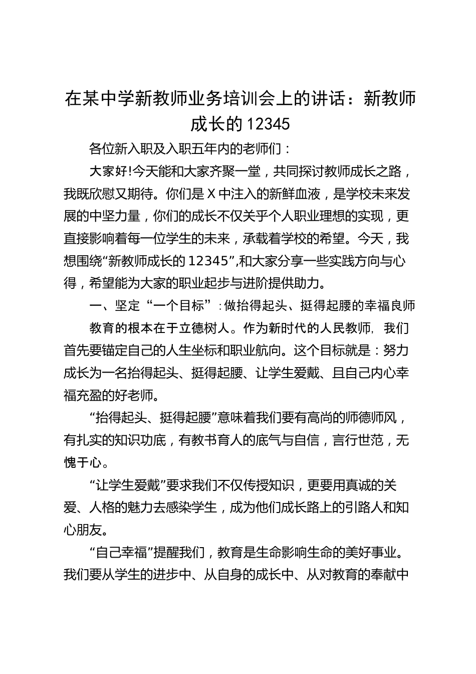 在某中學(xué)新教師業(yè)務(wù)培訓(xùn)會上的講話:新教師成長的12345各位新入職及入職五年內(nèi)的老師們:大家好!今天能和大家齊聚一堂,共同探討教師成長之路,我既欣慰又期待。你們是X中注入的新鮮血液,是學(xué)校未來發(fā)展的中堅力量,你們的成長不僅關(guān)乎個人職業(yè)理想的實現(xiàn),更直接影響著每一位學(xué)生的未來,承載著學(xué)校的希望。今天,我“想圍繞新教師成長的12345”,和大家分享一些實踐方向與心得,希望能為大家的職業(yè)起步與進階提供助力。一、堅定“一個目標(biāo)”:做抬得起頭、挺得起腰的幸福良師教育的根本在于立德人。作新代的人民教,我樹為時師們首先要錨定自己的人生坐標(biāo)和職業(yè)航向。這...