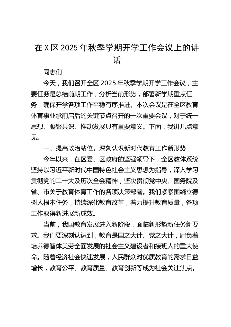在X區(qū)2025年秋季學(xué)期開學(xué)工作會議上的講話同志們:今天,我們召開全區(qū)2025年秋季學(xué)期開學(xué)工作會議,主要任務(wù)是總結(jié)前期工作,分析當(dāng)前形勢,部署新學(xué)期重點任務(wù),確保開學(xué)各項工作平穩(wěn)有序推進(jìn)。本次會議是在全區(qū)教育體育事業(yè)承前啟后的關(guān)鍵節(jié)點召開的一次重要會議,對于統(tǒng)一思想、凝聚共識、推動發(fā)展具有重要意義。下面,我講幾點意見。一、提高政治站位,深刻認(rèn)識新時代教育工作新形勢今年以來,在區(qū)委、區(qū)政府的堅強(qiáng)領(lǐng)導(dǎo)下,全區(qū)教體系統(tǒng)堅持以習(xí)近平新時代中國特色社會主義思想為指導(dǎo),深入學(xué)習(xí)貫徹黨的二十大及歷次全會精神,堅決貫徹黨中央、國務(wù)院及省、市關(guān)于教...