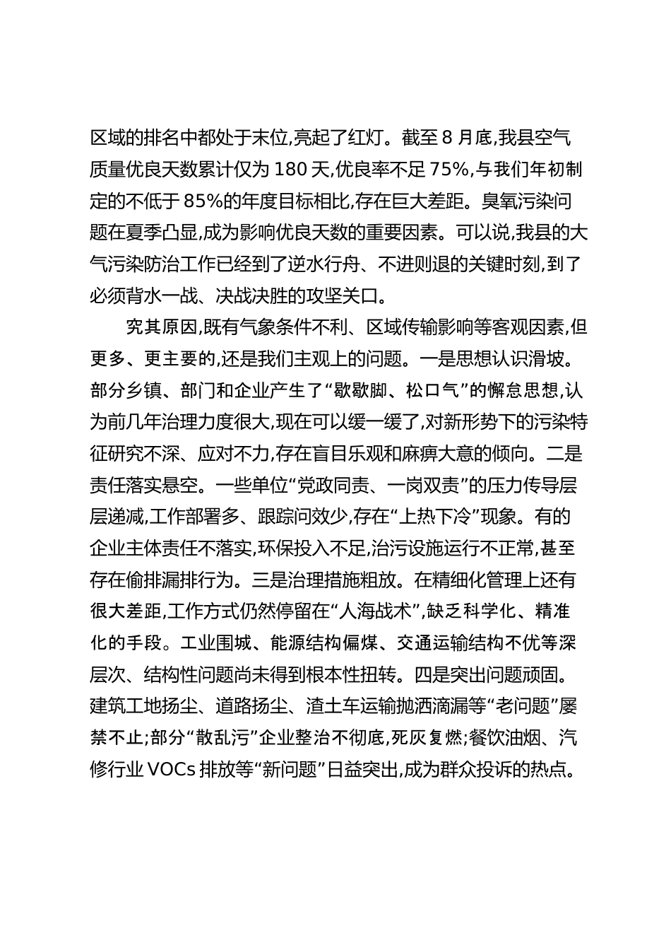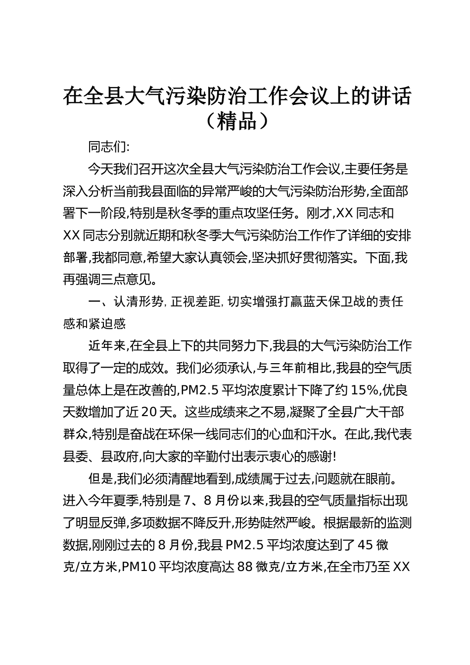 在全縣大氣污染防治工作會議上的講話(精品)同志們:今天我們召開這次全縣大氣污染防治工作會議,主要任務(wù)是深入分析當前我縣面臨的異常嚴峻的大氣污染防治形勢,全面部署下一階段,特別是秋冬季的重點攻堅任務(wù)。剛才,XX同志和XX同志分別就近期和秋冬季大氣污染防治工作作了詳細的安排部署,我都同意,希望大家認真領(lǐng)會,堅決抓好貫徹落實。下面,我再強調(diào)三點意見。一、認清形勢,正視差距,切實增強打贏藍天保衛(wèi)戰(zhàn)的責任感和緊迫感近年來,在全縣上下的共同努力下,我縣的大氣污染防治工作取得了一定的成效。我們必須承認,與三年前相比,我縣的空氣質(zhì)量總體上是在改善的,PM2.5平均...