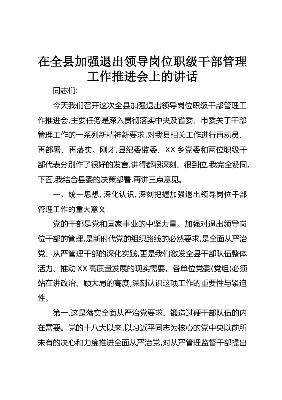 在全縣加強(qiáng)退出領(lǐng)導(dǎo)崗位職級干部管理工作推進(jìn)會(huì)上的講話同志們:今天我們召開這次全縣加強(qiáng)退出領(lǐng)導(dǎo)崗位職級干部管理工作推進(jìn)會(huì),主要任務(wù)是深入貫徹落實(shí)中央及省委、市委關(guān)于干部管理工作的一系列新精神新要求,對我縣相關(guān)工作進(jìn)行再動(dòng)員、再部署、再落實(shí)。剛才,縣紀(jì)委監(jiān)委、XX鄉(xiāng)黨委和兩位職級干部代表分別作了很好的發(fā)言,講得都很深刻、很到位,我完全贊同。下面,我結(jié)合縣委的決策部署,再講三點(diǎn)意見。一、統(tǒng)一思想,深化認(rèn)識,深刻把握加強(qiáng)退出領(lǐng)導(dǎo)崗位干部管理工作的重大意義黨的干部是黨和國家事業(yè)的中堅(jiān)力量。加強(qiáng)對退出領(lǐng)導(dǎo)崗位干部的管理,是新時(shí)代黨的組織路線的必然要...