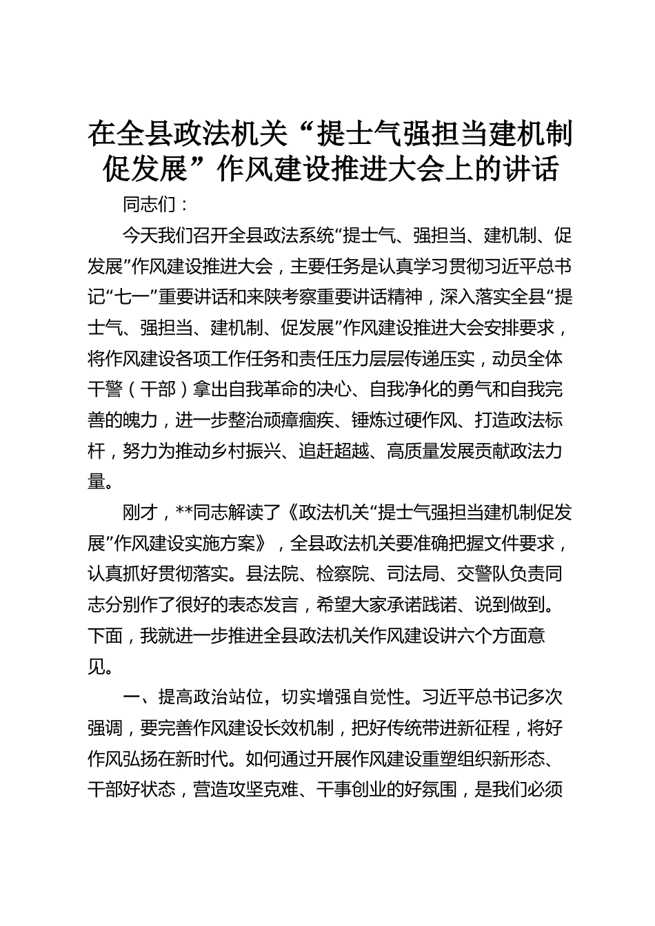 在全縣政法機(jī)關(guān)“提士氣強(qiáng)擔(dān)當(dāng)建機(jī)制促發(fā)展”作風(fēng)建設(shè)推進(jìn)大會(huì)上的講話同志們:“今天我們召開全縣政法系統(tǒng)提士氣、強(qiáng)擔(dān)當(dāng)、建機(jī)制、促”發(fā)展作風(fēng)建設(shè)推進(jìn)大會(huì),主要任務(wù)是認(rèn)真學(xué)習(xí)貫徹習(xí)近平總書“”“記七一重要講話和來陜考察重要講話精神,深入落實(shí)全縣提”士氣、強(qiáng)擔(dān)當(dāng)、建機(jī)制、促發(fā)展作風(fēng)建設(shè)推進(jìn)大會(huì)安排要求,將作風(fēng)建設(shè)各項(xiàng)工作任務(wù)和責(zé)任壓力層層傳遞壓實(shí),動(dòng)員全體干警(干部)拿出自我革命的決心、自我凈化的勇氣和自我完善的魄力,進(jìn)一步整治頑瘴痼疾、錘煉過硬作風(fēng)、打造政法標(biāo)桿,努力為推動(dòng)鄉(xiāng)村振興、追趕超越、高質(zhì)量發(fā)展貢獻(xiàn)政法力量。剛才,**“同志...
