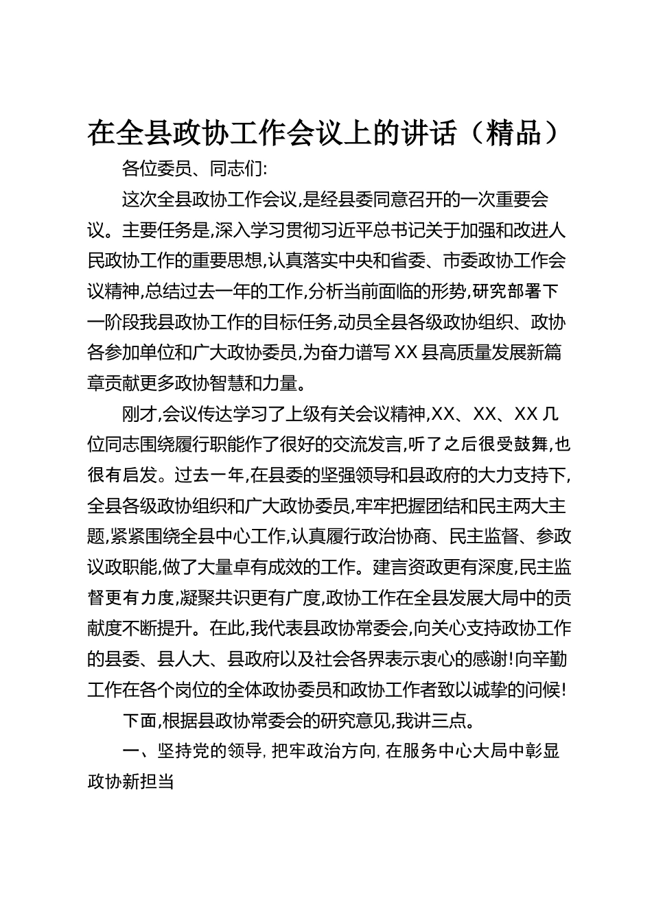 在全縣政協(xié)工作會(huì)議上的講話(精品)各位委員、同志們:這次全縣政協(xié)工作會(huì)議,是經(jīng)縣委同意召開(kāi)的一次重要會(huì)議。主要任務(wù)是,深入學(xué)習(xí)貫徹習(xí)近平總書(shū)記關(guān)于加強(qiáng)和改進(jìn)人民政協(xié)工作的重要思想,認(rèn)真落實(shí)中央和省委、市委政協(xié)工作會(huì)議精神,總結(jié)過(guò)去一年的工作,分析當(dāng)前面臨的形勢(shì),研究部署下一階段我縣政協(xié)工作的目標(biāo)任務(wù),動(dòng)員全縣各級(jí)政協(xié)組織、政協(xié)各參加單位和廣大政協(xié)委員,為奮力譜寫(xiě)XX縣高質(zhì)量發(fā)展新篇章貢獻(xiàn)更多政協(xié)智慧和力量。剛才,會(huì)議傳達(dá)學(xué)習(xí)了上級(jí)有關(guān)會(huì)議精神,XX、XX、XX幾位同志圍繞履行職能作了很好的交流發(fā)言,聽(tīng)了之后很受鼓舞,也很有啟。去一年發(fā)過(guò),在縣委的...