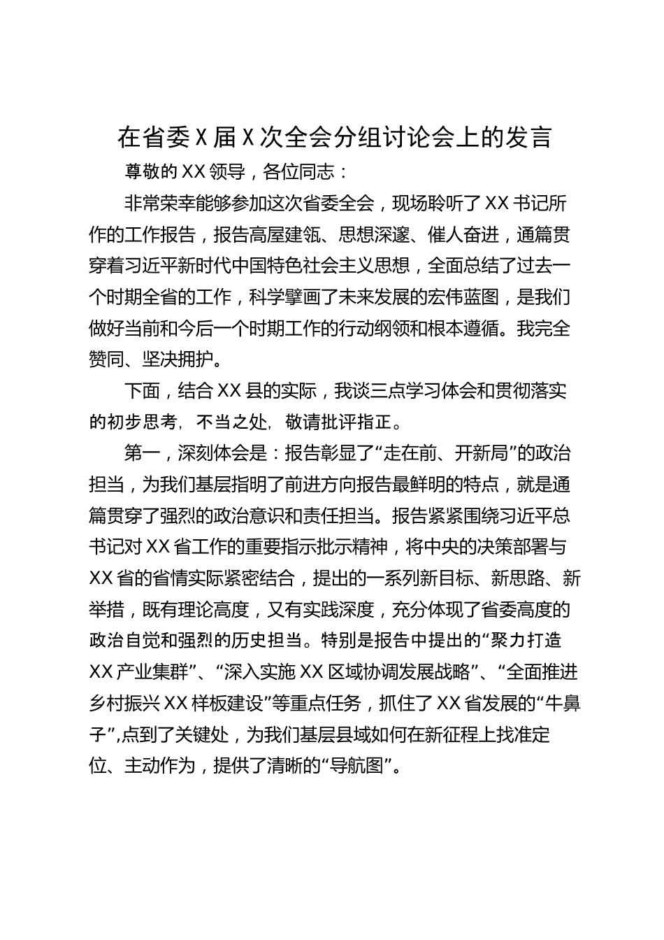 在省委X屆X次全會(huì)分組討論會(huì)上的發(fā)言尊敬的XX領(lǐng)導(dǎo),各位同志:非常榮幸能夠參加這次省委全會(huì),現(xiàn)場(chǎng)聆聽(tīng)了XX書(shū)記所作的工作報(bào)告,報(bào)告高屋建瓴、思想深邃、催人奮進(jìn),通篇貫穿著習(xí)近平新時(shí)代中國(guó)特色社會(huì)主義思想,全面總結(jié)了過(guò)去一個(gè)時(shí)期全省的工作,科學(xué)擘畫(huà)了未來(lái)發(fā)展的宏偉藍(lán)圖,是我們做好當(dāng)前和今后一個(gè)時(shí)期工作的行動(dòng)綱領(lǐng)和根本遵循。我完全贊同、堅(jiān)決擁護(hù)。下面,結(jié)合XX縣的實(shí)際,我談三點(diǎn)學(xué)習(xí)體會(huì)和貫徹落實(shí)的初步思考,不當(dāng)之,敬批指正。處請(qǐng)?jiān)u“”第一,深刻體會(huì)是:報(bào)告彰顯了走在前、開(kāi)新局的政治擔(dān)當(dāng),為我們基層指明了前進(jìn)方向報(bào)告最鮮明的特點(diǎn),就是通篇...