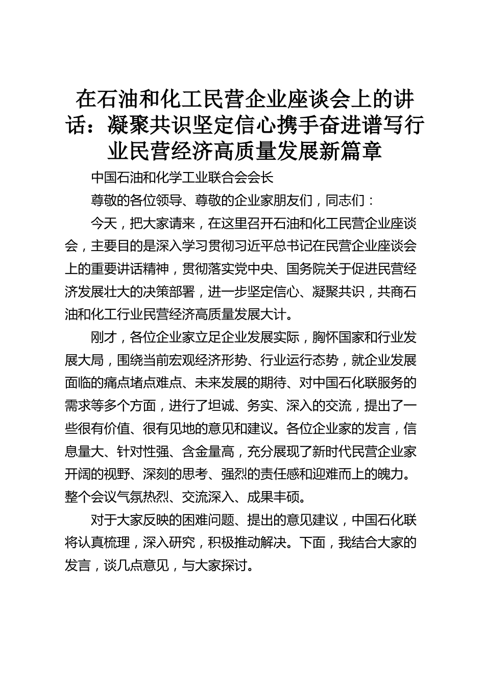在石油和化工民營企業(yè)座談會上的講話:凝聚共識堅定信心攜手奮進譜寫行業(yè)民營經濟高質量發(fā)展新篇章中國石油和化學工業(yè)聯(lián)合會會長尊敬的各位領導、尊敬的企業(yè)家朋友們,同志們:今天,把大家請來,在這里召開石油和化工民營企業(yè)座談會,主要目的是深入學習貫徹習近平總書記在民營企業(yè)座談會上的重要講話精神,貫徹落實黨中央、國務院關于促進民營經濟發(fā)展壯大的決策部署,進一步堅定信心、凝聚共識,共商石油和化工行業(yè)民營經濟高質量發(fā)展大計。剛才,各位企業(yè)家立足企業(yè)發(fā)展實際,胸懷國家和行業(yè)發(fā)展大局,圍繞當前宏觀經濟形勢、行業(yè)運行態(tài)勢,就企業(yè)發(fā)展面臨的痛點堵點...