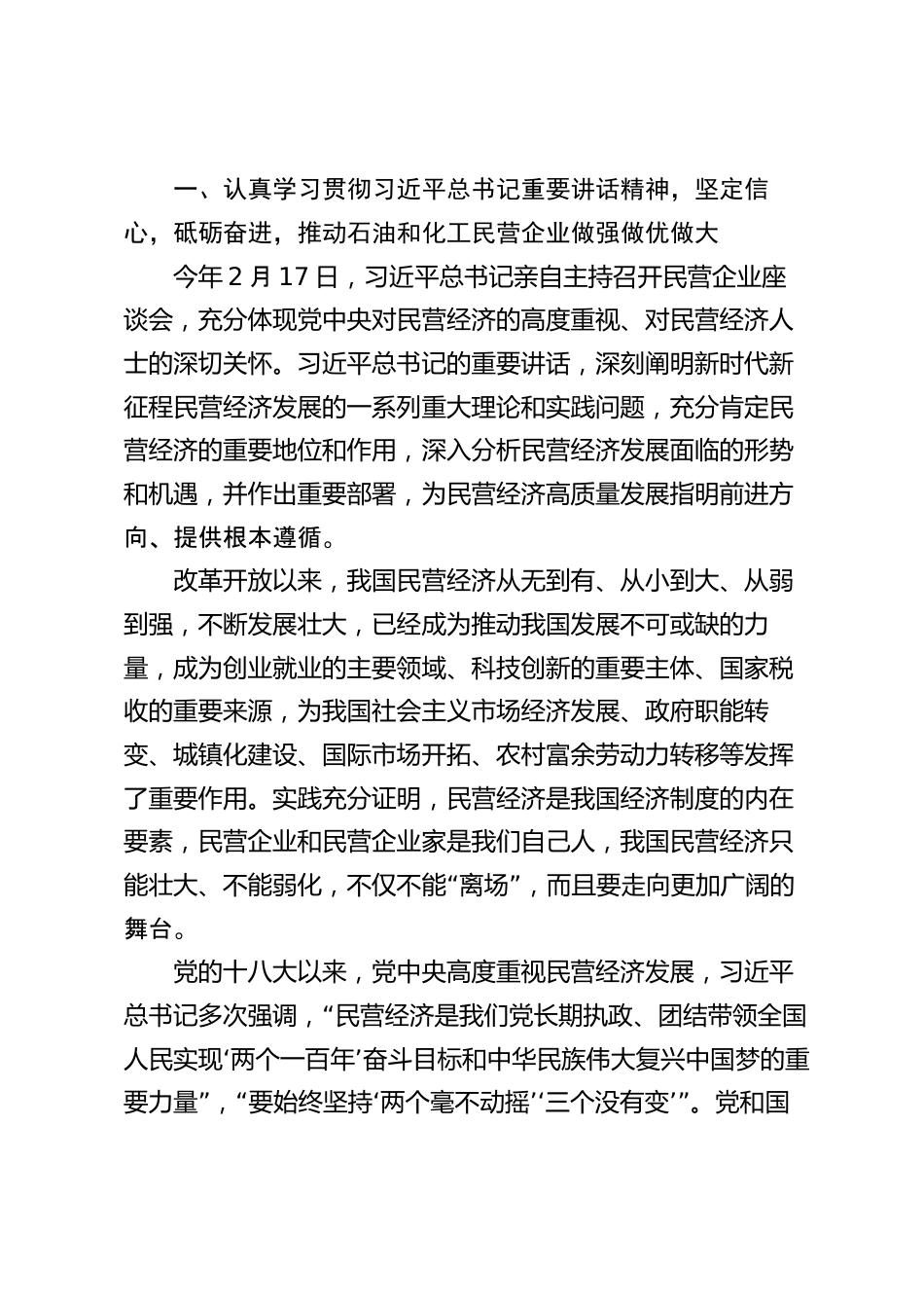 在石油和化工民營企業(yè)座談會上的講話:凝聚共識堅定信心攜手奮進譜寫行業(yè)民營經濟高質量發(fā)展新篇章