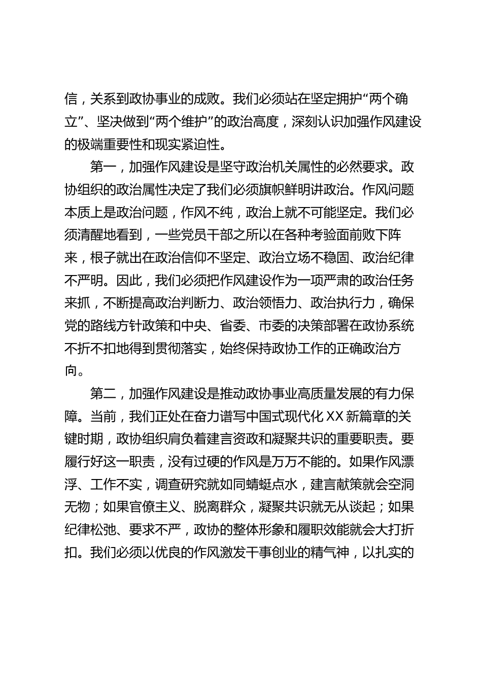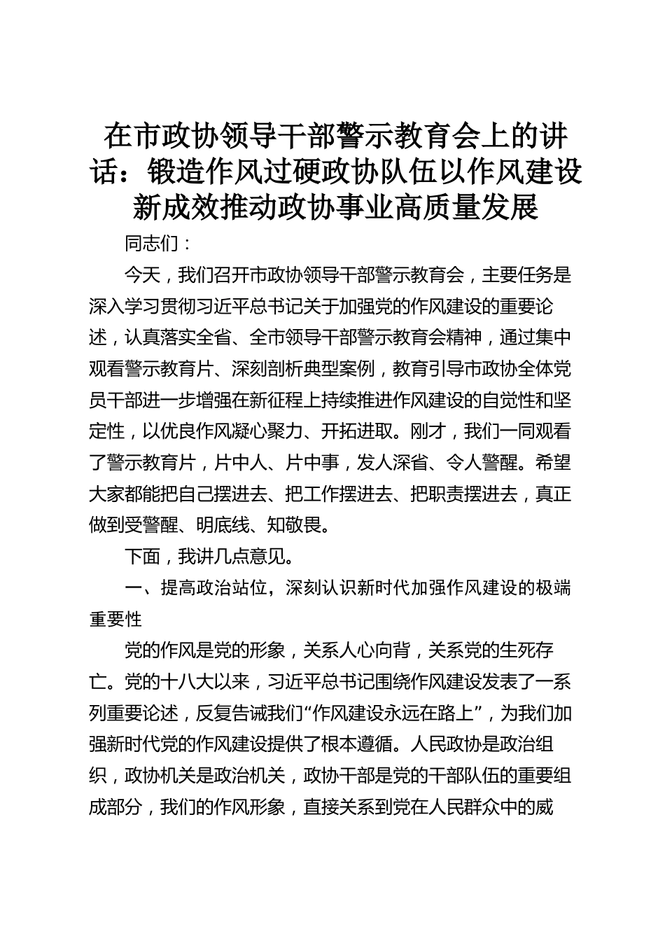 在市政協(xié)領(lǐng)導(dǎo)干部警示教育會上的講話:鍛造作風(fēng)過硬政協(xié)隊伍以作風(fēng)建設(shè)新成效推動政協(xié)事業(yè)高質(zhì)量發(fā)展同志們:今天,我們召開市政協(xié)領(lǐng)導(dǎo)干部警示教育會,主要任務(wù)是深入學(xué)習(xí)貫徹習(xí)近平總書記關(guān)于加強黨的作風(fēng)建設(shè)的重要論述,認(rèn)真落實全省、全市領(lǐng)導(dǎo)干部警示教育會精神,通過集中觀看警示教育片、深刻剖析典型案例,教育引導(dǎo)市政協(xié)全體黨員干部進一步增強在新征程上持續(xù)推進作風(fēng)建設(shè)的自覺性和堅定性,以優(yōu)良作風(fēng)凝心聚力、開拓進取。剛才,我們一同觀看了警示教育片,片中人、片中事,發(fā)人深省、令人警醒。希望大家都能把自己擺進去、把工作擺進去、把職責(zé)擺進去,真正做...