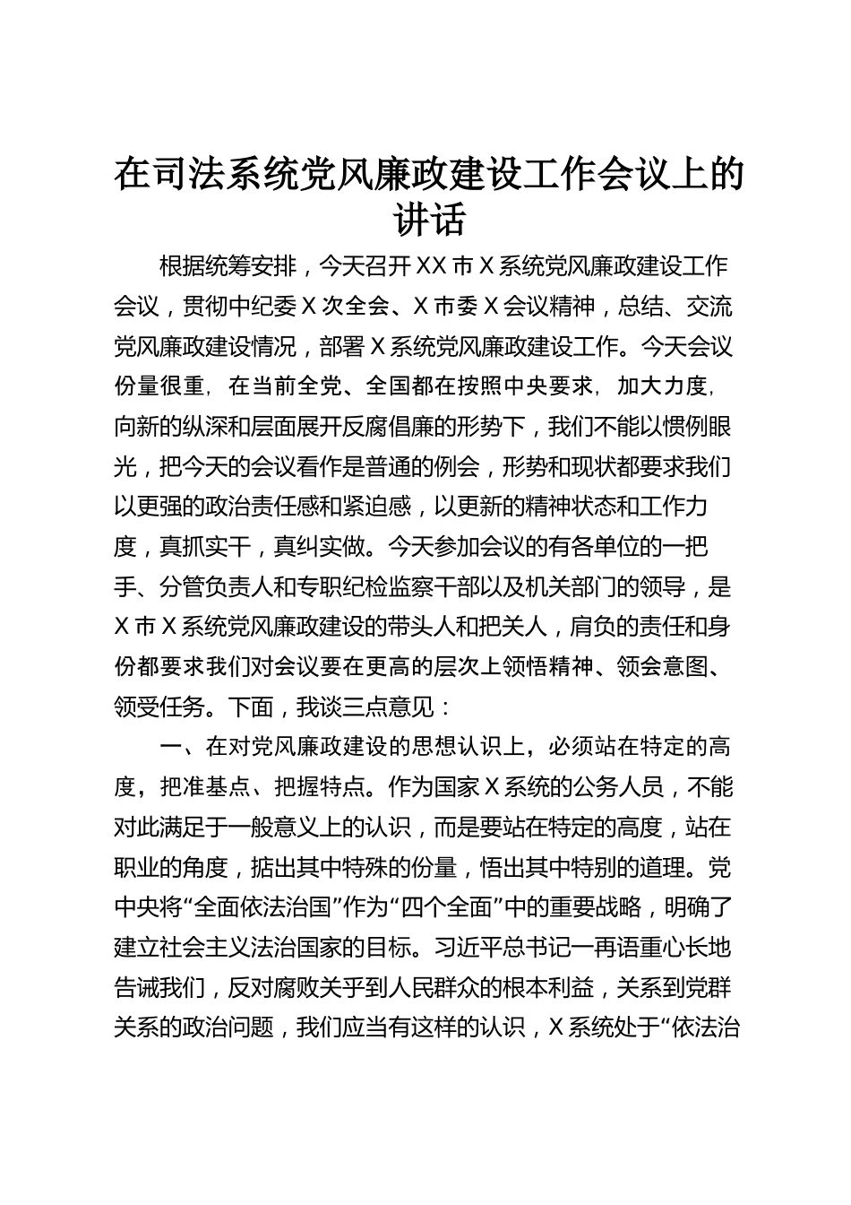 在司法系統(tǒng)黨風廉政建設工作會議上的講話根據(jù)統(tǒng)籌安排,今天召開XX市X系統(tǒng)黨風廉政建設工作會議,貫徹中紀委X次全會、X市委X會議精神,總結、交流黨風廉政建設情況,部署X系統(tǒng)黨風廉政建設工作。今天會議份量很重,在當前全黨、全國都在按照中央要求,加大力度,向新的縱深和層面展開反腐倡廉的形勢下,我們不能以慣例眼光,把今天的會議看作是普通的例會,形勢和現(xiàn)狀都要求我們以更強的政治責任感和緊迫感,以更新的精神狀態(tài)和工作力度,真抓實干,真糾實做。今天參加會議的有各單位的一把手、分管負責人和專職紀檢監(jiān)察干部以及機關部門的領導,是X市X系統(tǒng)黨風廉政建設...