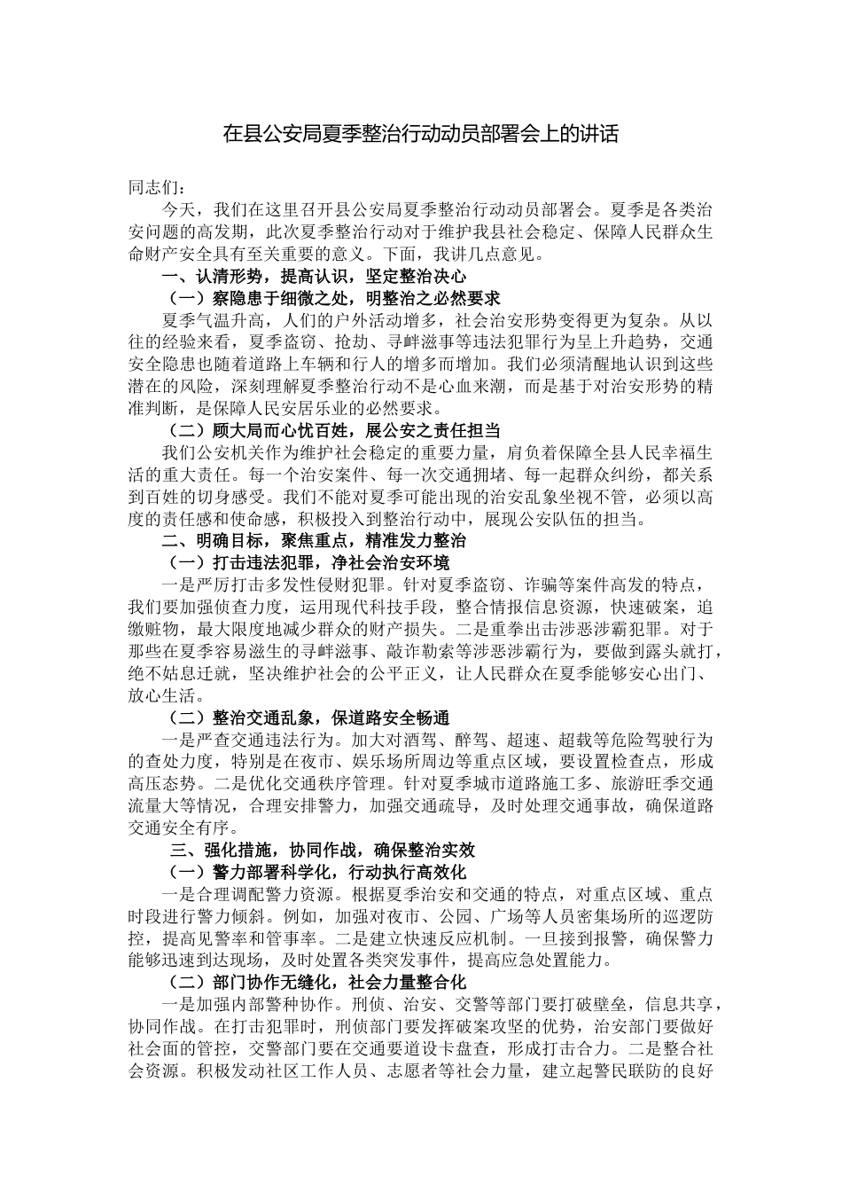 在縣公安局夏季整治行動動員部署會上的講話同志們:今天,我們在這里召開縣公安局夏季整治行動動員部署會。夏季是各類治安問題的高發(fā)期,此次夏季整治行動對于維護我縣社會穩(wěn)定、保障人民群眾生命財產(chǎn)安全具有至關(guān)重要的意義。下面,我講幾點意見。一、認清形勢,提高認識,堅定整治決心(一)察隱患于細微之處,明整治之必然要求夏季氣溫升高,人們的戶外活動增多,社會治安形勢變得更為復(fù)雜。從以往的經(jīng)驗來看,夏季盜竊、搶劫、尋釁滋事等違法犯罪行為呈上升趨勢,交通安全隱患也隨著道路上車輛和行人的增多而增加。我們必須清醒地認識到這些潛在的風(fēng)險,深刻理解夏季...