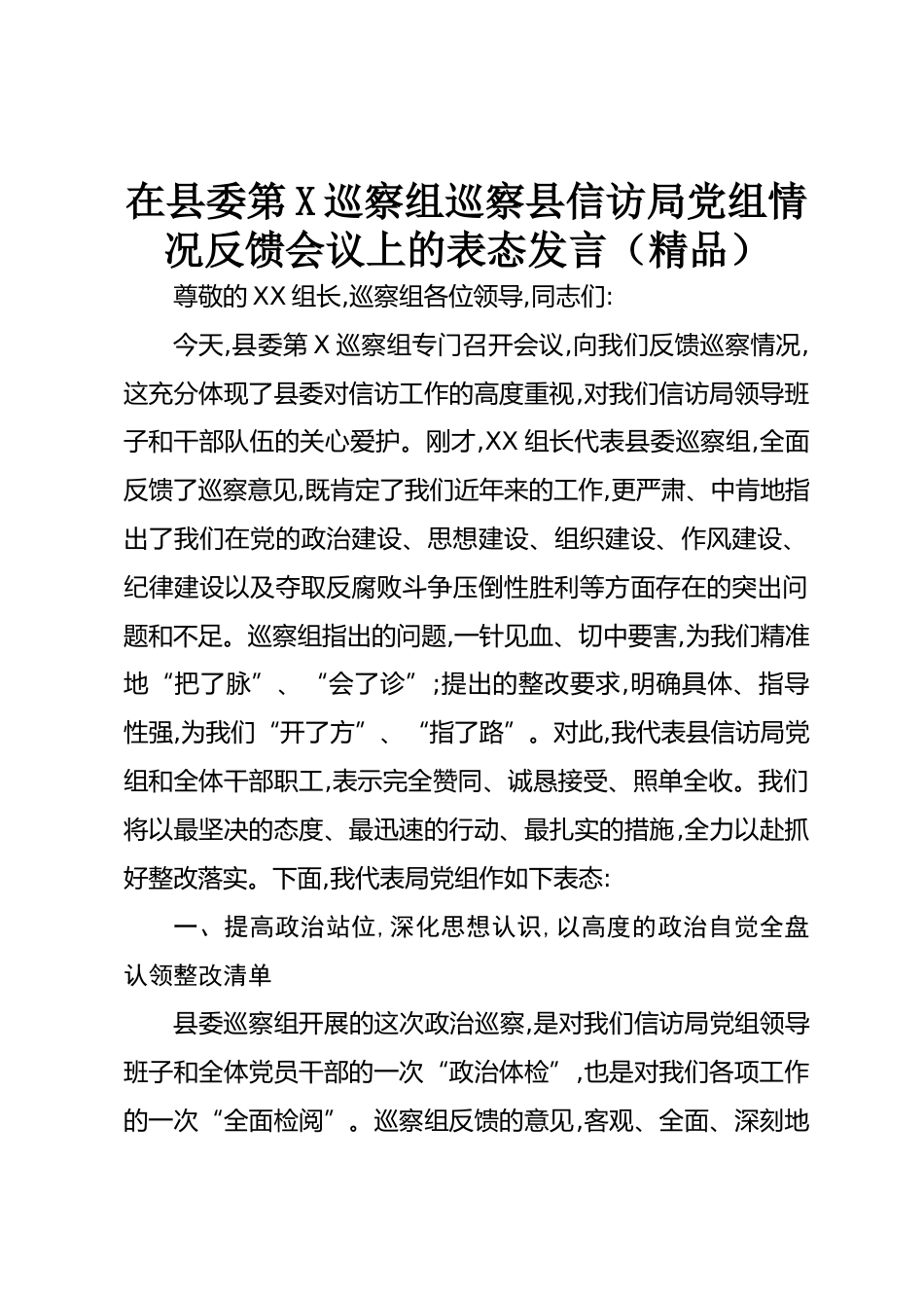 在縣委第X巡察組巡察縣信訪局黨組情況反饋會議上的表態(tài)發(fā)言(精品)