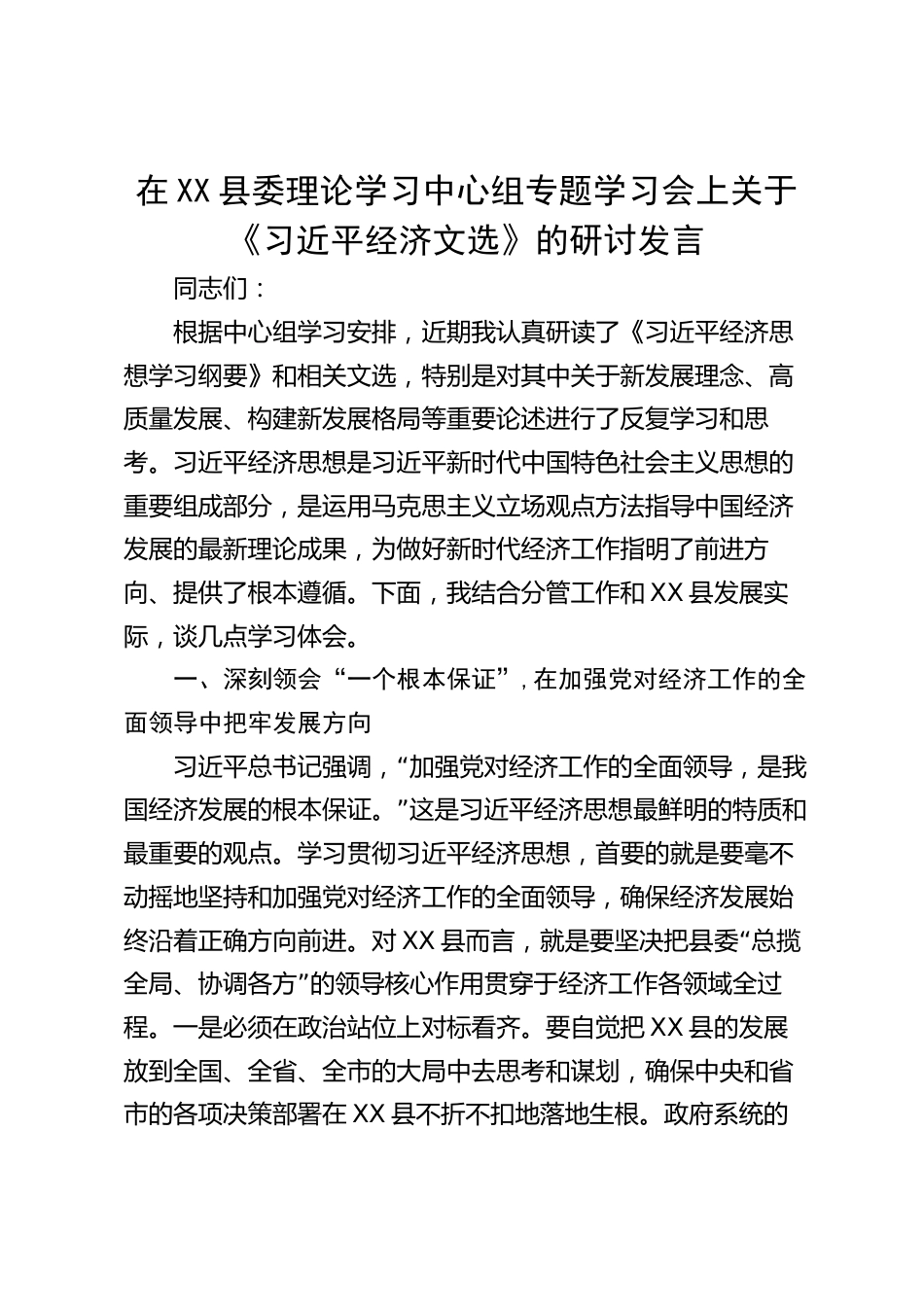 在XX縣委理論學(xué)習(xí)中心組專題學(xué)習(xí)會上關(guān)于《習(xí)近平經(jīng)濟(jì)文選》的研討發(fā)言同志們:根據(jù)中心組學(xué)習(xí)安排,近期我認(rèn)真研讀了《習(xí)近平經(jīng)濟(jì)思想學(xué)習(xí)綱要》和相關(guān)文選,特別是對其中關(guān)于新發(fā)展理念、高質(zhì)量發(fā)展、構(gòu)建新發(fā)展格局等重要論述進(jìn)行了反復(fù)學(xué)習(xí)和思考。習(xí)近平經(jīng)濟(jì)思想是習(xí)近平新時代中國特色社會主義思想的重要組成部分,是運(yùn)用馬克思主義立場觀點(diǎn)方法指導(dǎo)中國經(jīng)濟(jì)發(fā)展的最新理論成果,為做好新時代經(jīng)濟(jì)工作指明了前進(jìn)方向、提供了根本遵循。下面,我結(jié)合分管工作和XX縣發(fā)展實(shí)際,談幾點(diǎn)學(xué)習(xí)體會。一、深刻領(lǐng)會“一個根本保證”,在加強(qiáng)黨對經(jīng)濟(jì)工作的全面領(lǐng)導(dǎo)中把牢發(fā)展...