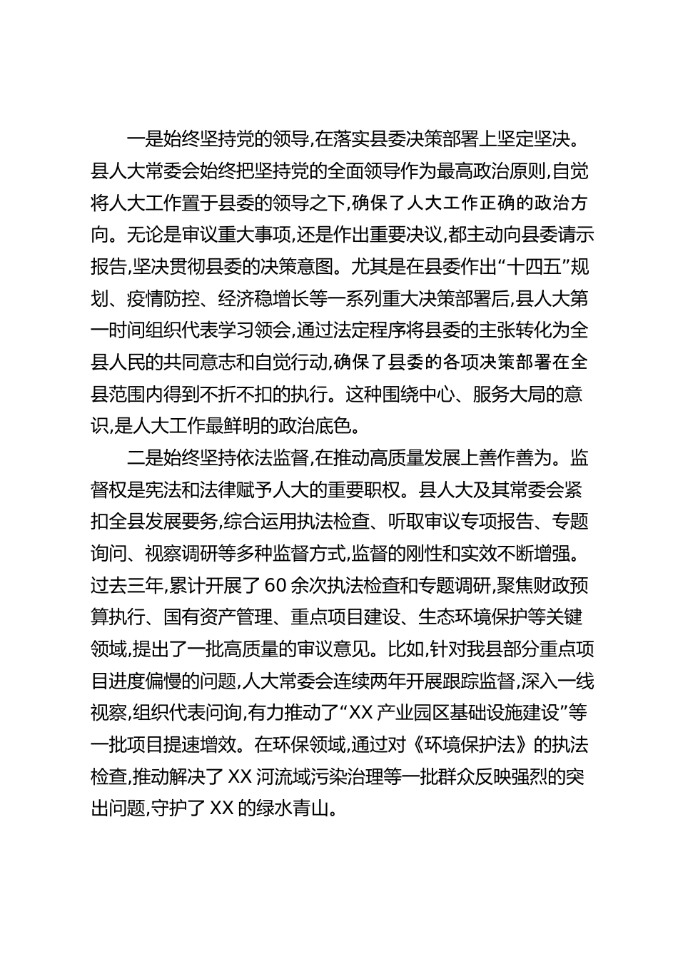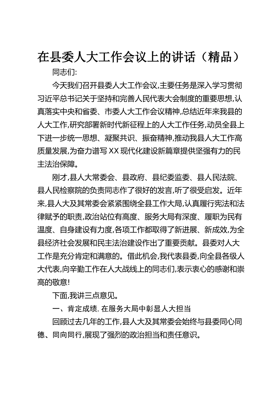 在縣委人大工作會議上的講話(精品)同志們:今天我們召開縣委人大工作會議,主要任務是深入學習貫徹習近平總書記關于堅持和完善人民代表大會制度的重要思想,認真落實中央和省委、市委人大工作會議精神,總結近年來我縣的人大工作,研究部署新時代新征程上的人大工作任務,動員全縣上下進一步統(tǒng)一思想、凝聚共識、振奮精神,推動我縣人大工作高質量發(fā)展,為奮力譜寫XX現(xiàn)代化建設新篇章提供堅強有力的民主法治保障。剛才,縣人大常委會、縣政府、縣紀委監(jiān)委、縣人民法院、縣人民檢察院的負責同志作了很好的發(fā)言,聽了很受啟發(fā)。近年來,縣人大及其常委會緊緊圍繞全縣工作大局,認真履...