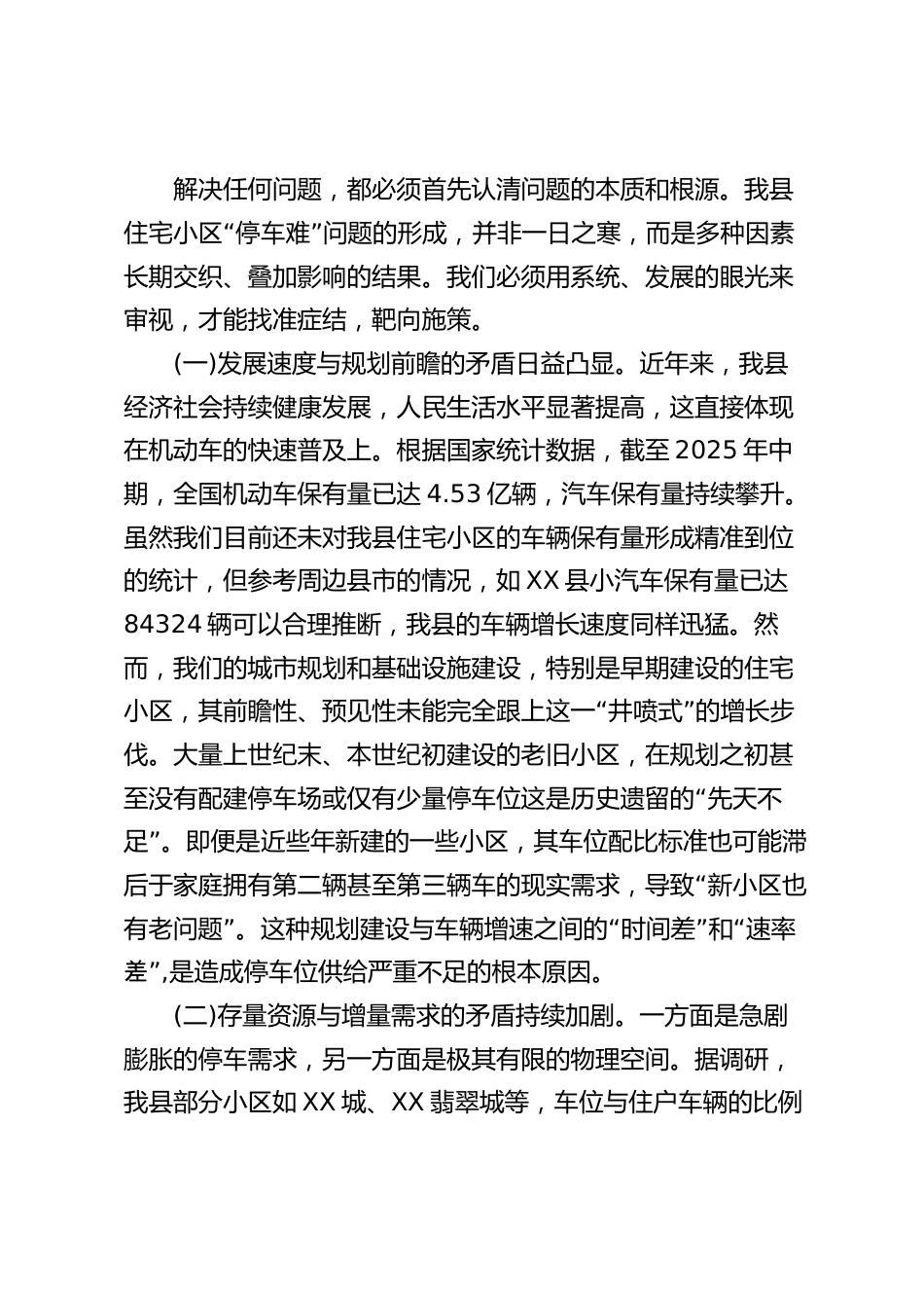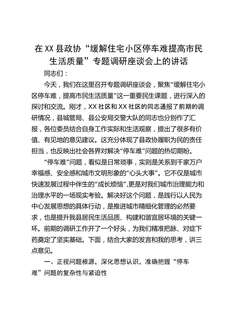 在XX縣政協(xié)“緩解住宅小區(qū)停車難提高市民生活質(zhì)量”專題調(diào)研座談會(huì)上的講話同志們:“今天,我們?cè)谶@里召開專題調(diào)研座談會(huì),聚焦緩解住宅小”區(qū)停車難,提高市民生活質(zhì)量這一重要民生課題,進(jìn)行深入的探討和交流。剛才,XX社區(qū)和XX社區(qū)的同志通報(bào)了前期的調(diào)研情況,縣城管局、縣公安局交警大隊(duì)的同志也分別作了匯報(bào),各位委員結(jié)合自身工作實(shí)際和生活觀察,提出了很多有價(jià)值、有見(jiàn)地的意見(jiàn)建議。這充分體現(xiàn)了縣政協(xié)履職為民的責(zé)任“”擔(dān)當(dāng),也反映出社會(huì)各界對(duì)解決停車難問(wèn)題的熱切期盼?!啊蓖\囯y問(wèn)題,看似是日常瑣事,實(shí)則是關(guān)系到千家萬(wàn)戶“”幸福感、安全感和城市文...