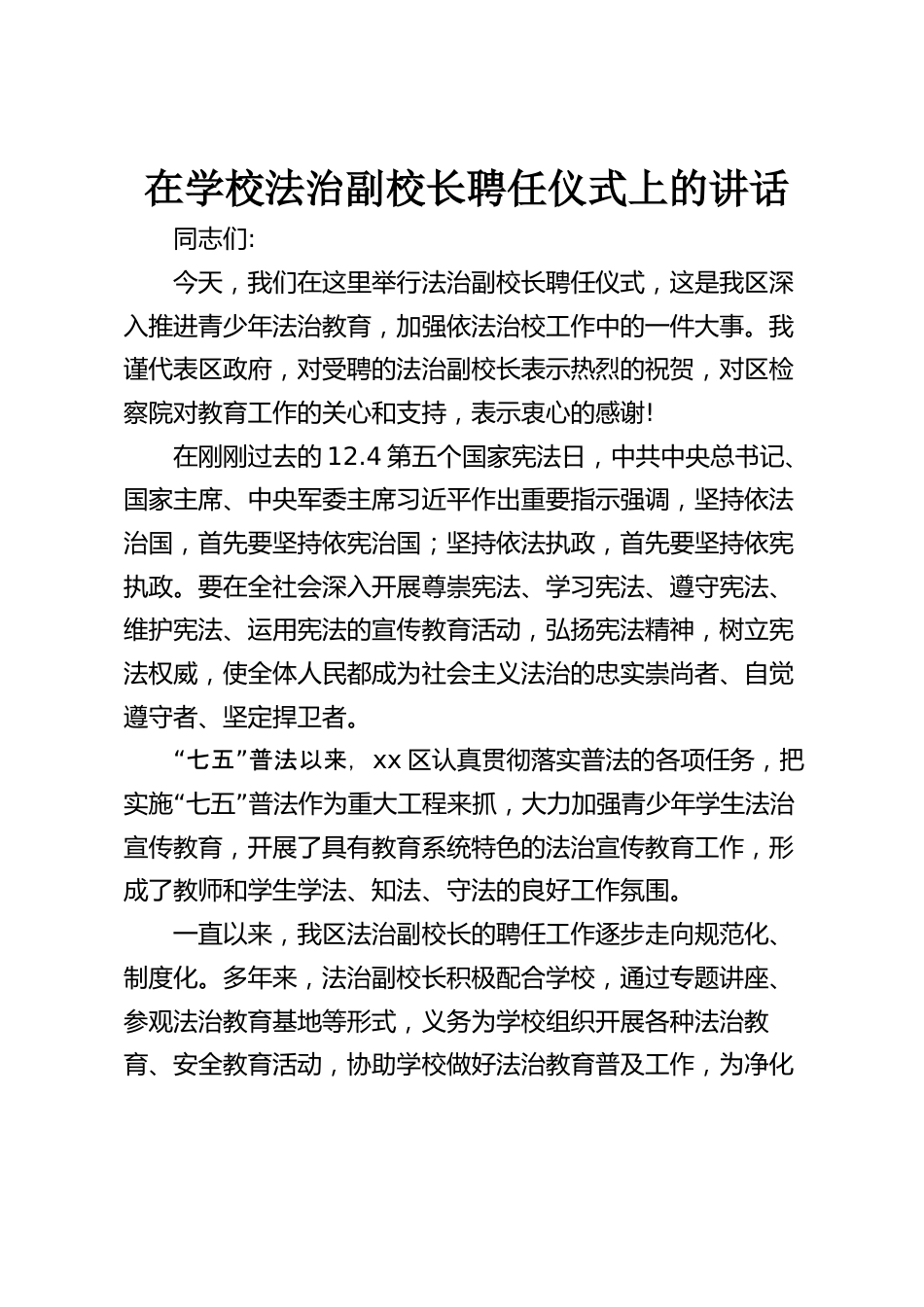 在學(xué)校法治副校長聘任儀式上的講話同志們:今天,我們在這里舉行法治副校長聘任儀式,這是我區(qū)深入推進青少年法治教育,加強依法治校工作中的一件大事。我謹代表區(qū)政府,對受聘的法治副校長表示熱烈的祝賀,對區(qū)檢察院對教育工作的關(guān)心和支持,表示衷心的感謝!在剛剛過去的12.4第五個國家憲法日,中共中央總書記、國家主席、中央軍委主席習(xí)近平作出重要指示強調(diào),堅持依法治國,首先要堅持依憲治國;堅持依法執(zhí)政,首先要堅持依憲執(zhí)政。要在全社會深入開展尊崇憲法、學(xué)習(xí)憲法、遵守憲法、維護憲法、運用憲法的宣傳教育活動,弘揚憲法精神,樹立憲法權(quán)威,使全體人民都成為...