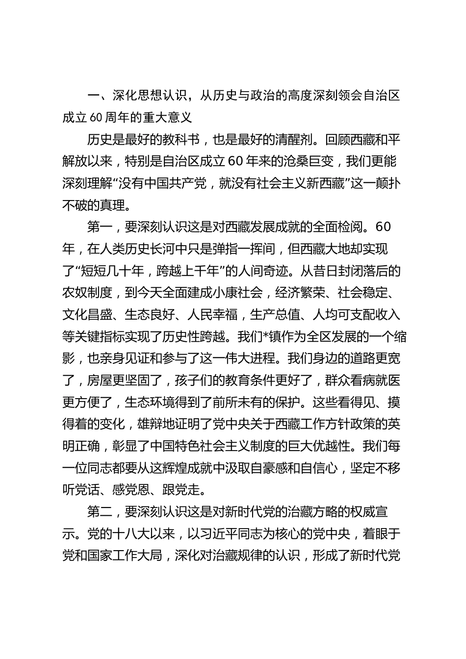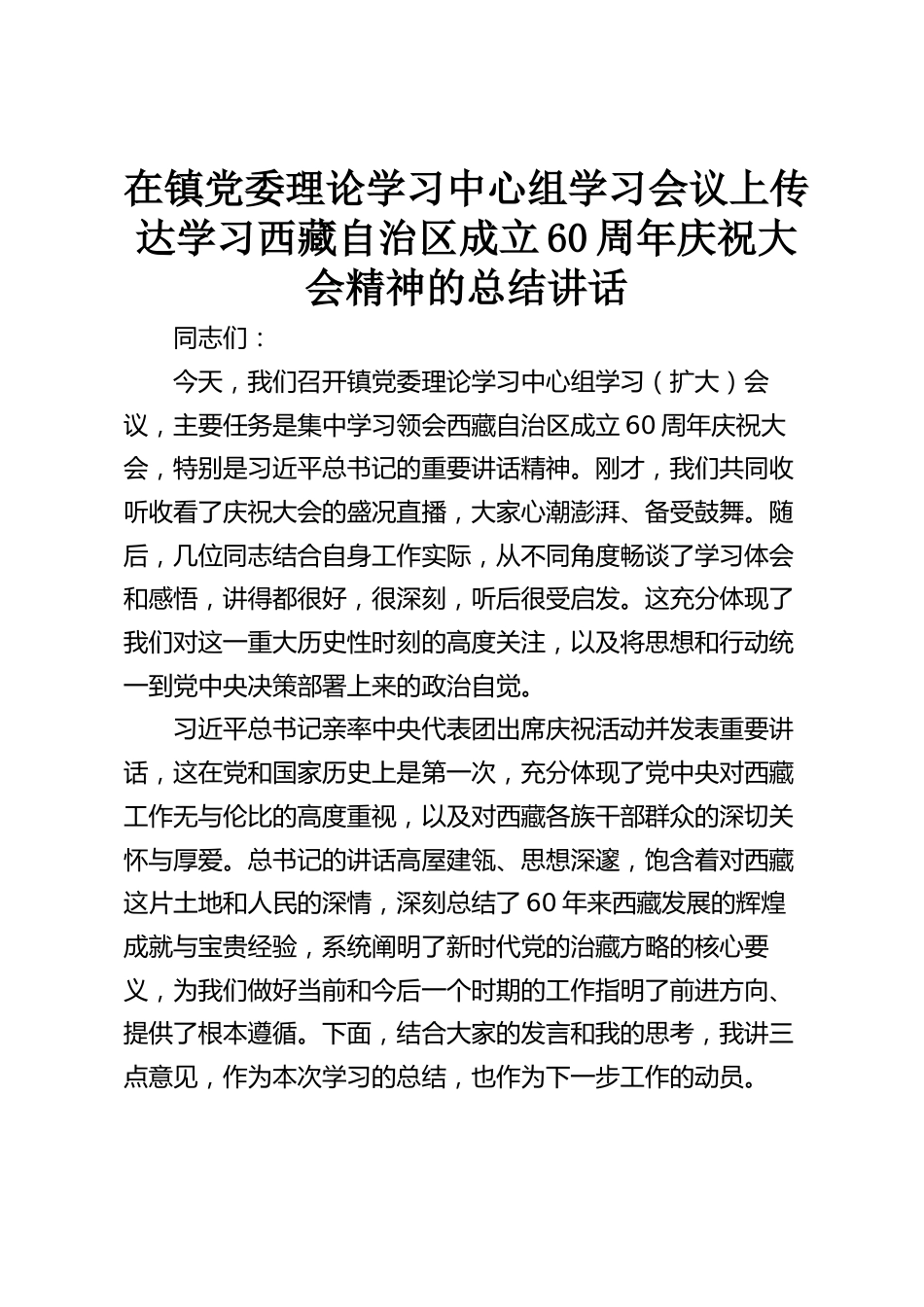 在鎮(zhèn)黨委理論學(xué)習(xí)中心組學(xué)習(xí)會(huì)議上傳達(dá)學(xué)習(xí)西藏自治區(qū)成立60周年慶祝大會(huì)精神的總結(jié)講話同志們:今天,我們召開鎮(zhèn)黨委理論學(xué)習(xí)中心組學(xué)習(xí)(擴(kuò)大)會(huì)議,主要任務(wù)是集中學(xué)習(xí)領(lǐng)會(huì)西藏自治區(qū)成立60周年慶祝大會(huì),特別是習(xí)近平總書記的重要講話精神。剛才,我們共同收聽收看了慶祝大會(huì)的盛況直播,大家心潮澎湃、備受鼓舞。隨后,幾位同志結(jié)合自身工作實(shí)際,從不同角度暢談了學(xué)習(xí)體會(huì)和感悟,講得都很好,很深刻,聽后很受啟發(fā)。這充分體現(xiàn)了我們對(duì)這一重大歷史性時(shí)刻的高度關(guān)注,以及將思想和行動(dòng)統(tǒng)一到黨中央決策部署上來(lái)的政治自覺。習(xí)近平總書記親率中央代表團(tuán)出席慶?;?..