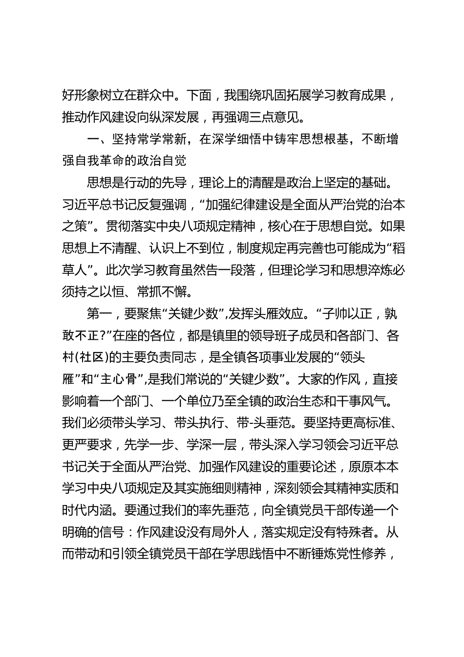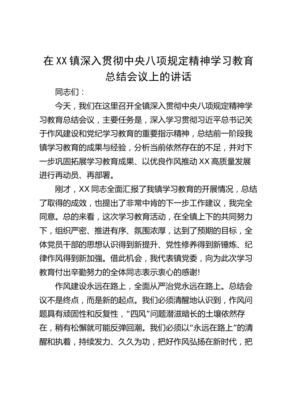 在XX鎮(zhèn)深入貫徹中央八項規(guī)定精神學(xué)習教育總結(jié)會議上的講話同志們:今天,我們在這里召開全鎮(zhèn)深入貫徹中央八項規(guī)定精神學(xué)習教育總結(jié)會議,主要任務(wù)是,深入學(xué)習貫徹習近平總書記關(guān)于作風建設(shè)和黨紀學(xué)習教育的重要指示精神,總結(jié)前一階段我鎮(zhèn)學(xué)習教育的成果與經(jīng)驗,分析當前依然存在的不足,并對下一步鞏固拓展學(xué)習教育成果、以優(yōu)良作風推動XX高質(zhì)量發(fā)展進行再動員、再部署。剛才,XX同志全面匯報了我鎮(zhèn)學(xué)習教育的開展情況,總結(jié)了取得的成效,也提出了非常中肯的下一步工作建議,我完全同意。總的來看,這次學(xué)習教育活動,在全鎮(zhèn)上下的共同努力下,組織嚴密、推進有序、氛...