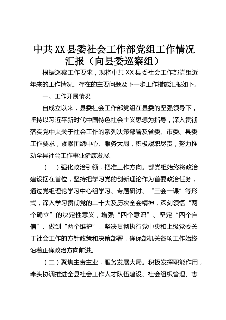 中共XX縣委社會工作部黨組工作情況匯報(向縣委巡察組)根據(jù)巡察工作要求,現(xiàn)將中共XX縣委社會工作部黨組近年來的工作情況、存在的主要問題及下一步工作措施匯報如下。一、工作開展情況自成立以來,縣委社會工作部黨組在縣委的堅強領(lǐng)導(dǎo)下,堅持以習(xí)近平新時代中國特色社會主義思想為指導(dǎo),深入貫徹落實黨中央關(guān)于社會工作的系列決策部署及省委、市委、縣委工作要求,緊緊圍繞中心、服務(wù)大局,積極履職盡責(zé),努力推動全縣社會工作事業(yè)健康發(fā)展。(一)強化政治引領(lǐng),把準工作方向。部黨組始終將政治建設(shè)擺在首位,堅持把學(xué)習(xí)黨的創(chuàng)新理論作為首要政治任務(wù),通過黨組理論學(xué)...