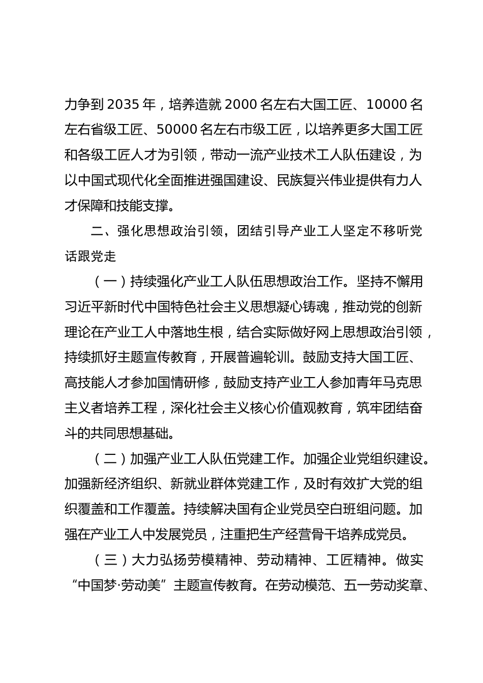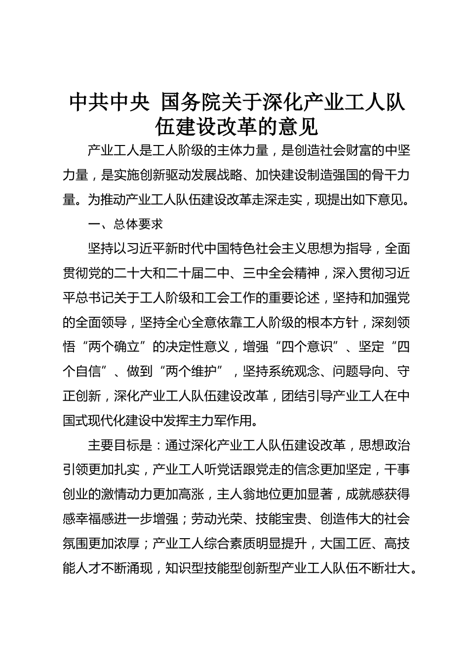 中共中央國務(wù)院關(guān)于深化產(chǎn)業(yè)工人隊伍建設(shè)改革的意見產(chǎn)業(yè)工人是工人階級的主體力量,是創(chuàng)造社會財富的中堅力量,是實施創(chuàng)新驅(qū)動發(fā)展戰(zhàn)略、加快建設(shè)制造強國的骨干力量。為推動產(chǎn)業(yè)工人隊伍建設(shè)改革走深走實,現(xiàn)提出如下意見。一、總體要求堅持以習(xí)近平新時代中國特色社會主義思想為指導(dǎo),全面貫徹黨的二十大和二十屆二中、三中全會精神,深入貫徹習(xí)近平總書記關(guān)于工人階級和工會工作的重要論述,堅持和加強黨的全面領(lǐng)導(dǎo),堅持全心全意依靠工人階級的根本方針,深刻領(lǐng)悟“兩個確立”的決定性意義,增強“四個意識”、堅定“四個自信”、做到“兩個維護”,堅持系統(tǒng)觀念、問...