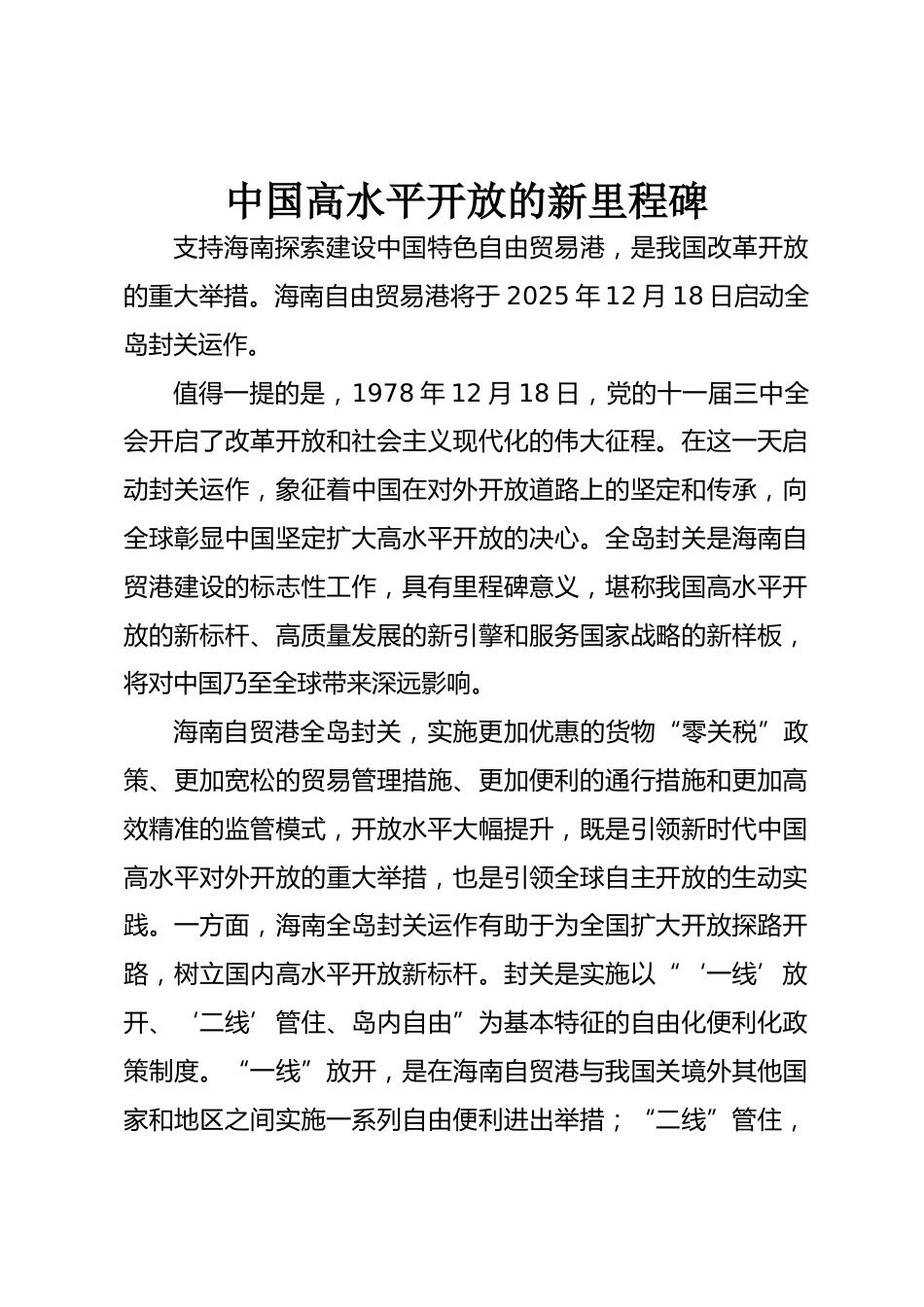 中國高水平開放的新里程碑支持海南探索建設中國特色自由貿易港,是我國改革開放的重大舉措。海南自由貿易港將于2025年12月18日啟動全島封關運作。值得一提的是,1978年12月18日,黨的十一屆三中全會開啟了改革開放和社會主義現(xiàn)代化的偉大征程。在這一天啟動封關運作,象征著中國在對外開放道路上的堅定和傳承,向全球彰顯中國堅定擴大高水平開放的決心。全島封關是海南自貿港建設的標志性工作,具有里程碑意義,堪稱我國高水平開放的新標桿、高質量發(fā)展的新引擎和服務國家戰(zhàn)略的新樣板,將對中國乃至全球帶來深遠影響。海南自貿港全島封關,實施更加優(yōu)惠的貨物“零關稅”...