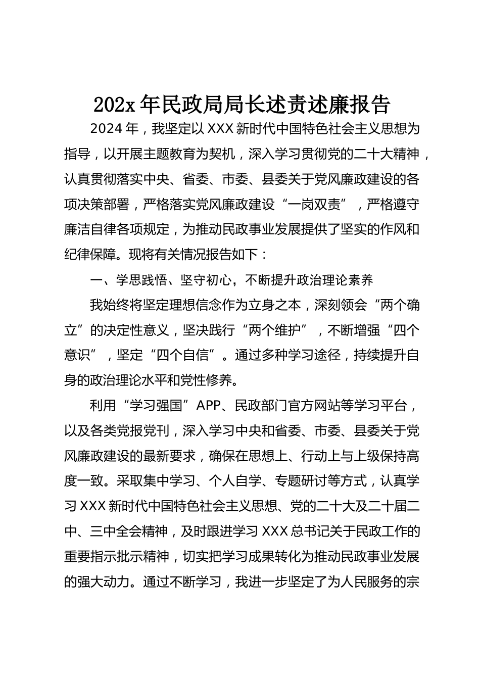 202x年民政局局長述責(zé)述廉報告2024年,我堅定以XXX新時代中國特色社會主義思想為指導(dǎo),以開展主題教育為契機,深入學(xué)習(xí)貫徹黨的二十大精神,認(rèn)真貫徹落實中央、省委、市委、縣委關(guān)于黨風(fēng)廉政建設(shè)的各項決策部署,嚴(yán)格落實黨風(fēng)廉政建設(shè)“一崗雙責(zé)”,嚴(yán)格遵守廉潔自律各項規(guī)定,為推動民政事業(yè)發(fā)展提供了堅實的作風(fēng)和紀(jì)律保障?,F(xiàn)將有關(guān)情況報告如下:一、學(xué)思踐悟、堅守初心,不斷提升政治理論素養(yǎng)我始終將堅定理想信念作為立身之本,深刻領(lǐng)會“兩個確立”的決定性意義,堅決踐行“兩個維護”,不斷增強“四個意識”,堅定“四個自信”。通過多種學(xué)習(xí)途徑,持續(xù)提升自身...