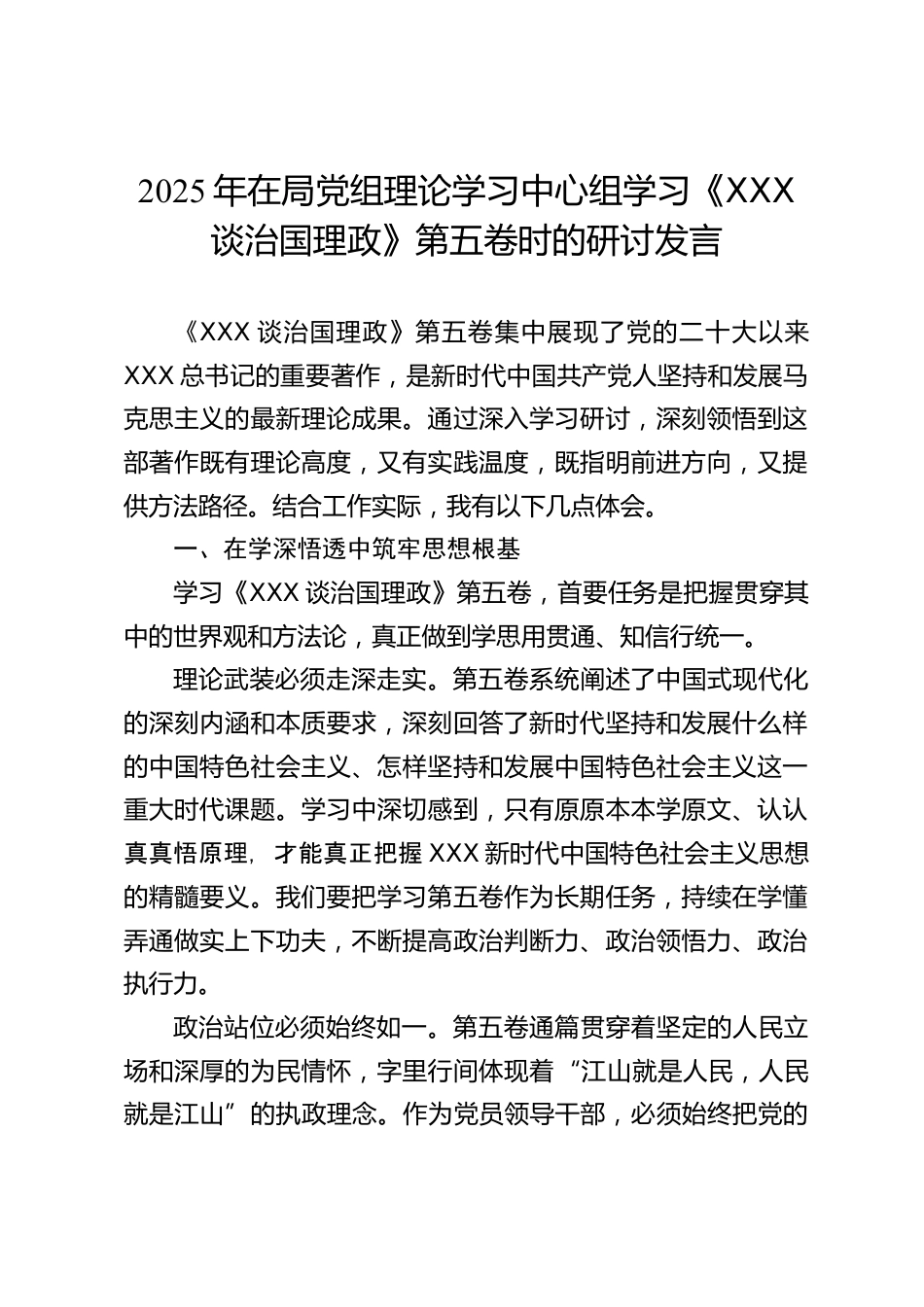 2025年在局黨組理論學習中心組學習《XXX談治國理政》第五卷時的研討發(fā)言《XXX談治國理政》第五卷集中展現(xiàn)了黨的二十大以來XXX總書記的重要著作,是新時代中國共產(chǎn)黨人堅持和發(fā)展馬克思主義的最新理論成果。通過深入學習研討,深刻領悟到這部著作既有理論高度,又有實踐溫度,既指明前進方向,又提供方法路徑。結合工作實際,我有以下幾點體會。一、在學深悟透中筑牢思想根基學習《XXX談治國理政》第五卷,首要任務是把握貫穿其中的世界觀和方法論,真正做到學思用貫通、知信行統(tǒng)一。理論武裝必須走深走實。第五卷系統(tǒng)闡述了中國式現(xiàn)代化的深刻內涵和本質要求,深刻回答了...