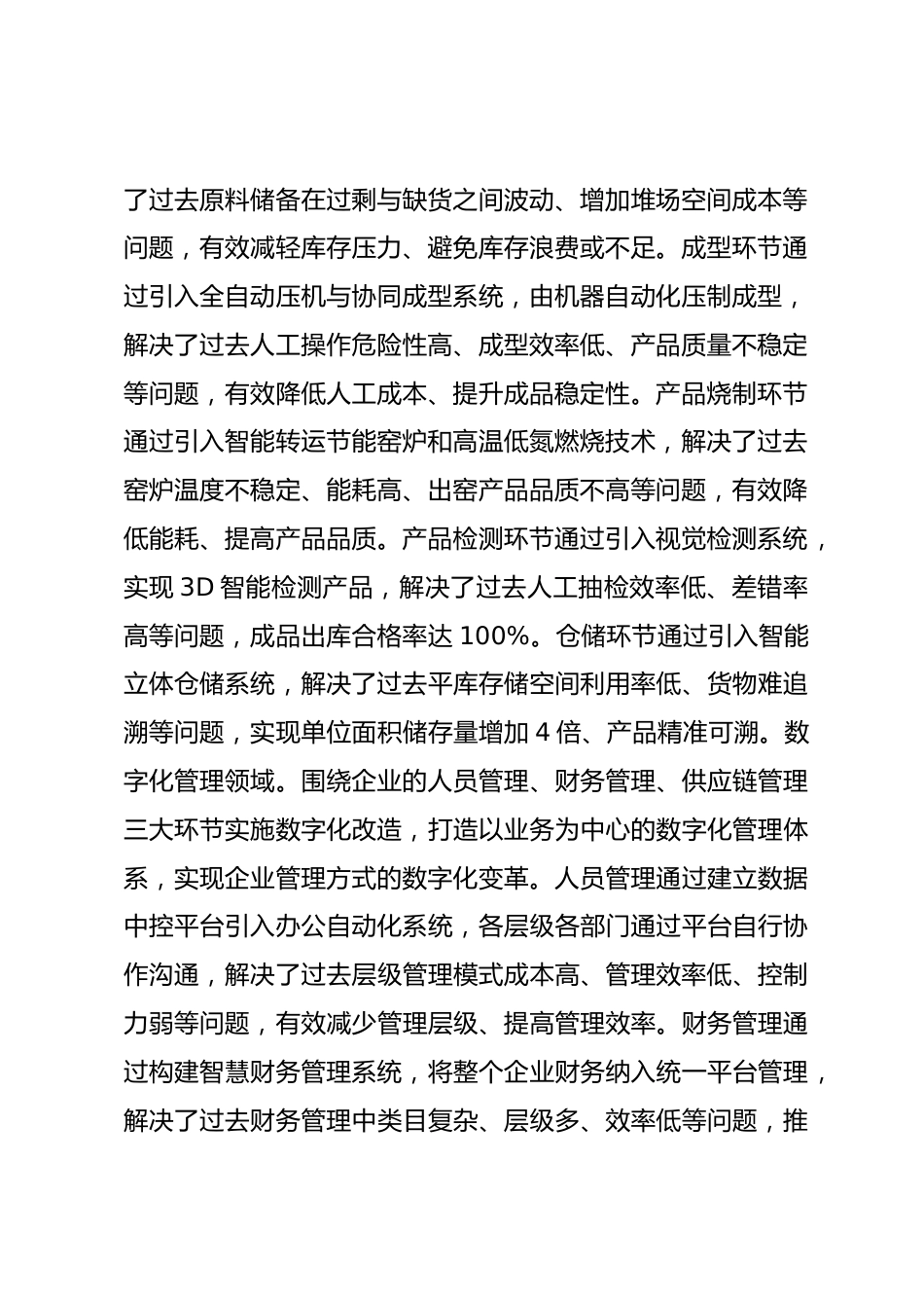 Xx公司數(shù)字化轉(zhuǎn)型情況的調(diào)研報告洛陽利爾功能材料有限公司(以下簡稱“洛陽利爾”)是北京利爾高溫材料股份有限公司的全資子公司,成立于2011年,主要從事耐火原料及制品的研發(fā)、生產(chǎn)、銷售及服務(wù)。該企業(yè)自2018年開展數(shù)字化轉(zhuǎn)型,2020年完成全國首條高溫材料數(shù)字化生產(chǎn)線建設(shè),帶動企業(yè)從生產(chǎn)到管理全面轉(zhuǎn)型重塑,為企業(yè)發(fā)展深度賦能。2021年以來,企業(yè)產(chǎn)能提高4倍,主營業(yè)務(wù)收入增長52.4%。市委政研室對洛陽利爾數(shù)字化轉(zhuǎn)型情況進(jìn)行了調(diào)研,梳理總結(jié)了經(jīng)驗做法,形成了此調(diào)研報告。一、企業(yè)數(shù)字化轉(zhuǎn)型情況洛陽利爾圍繞數(shù)字化轉(zhuǎn)型戰(zhàn)略目標(biāo),深度謀篇布局,以生產(chǎn)線數(shù)字化...