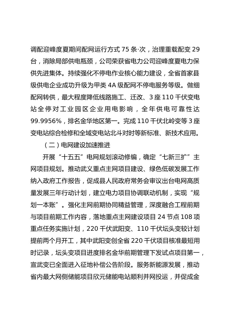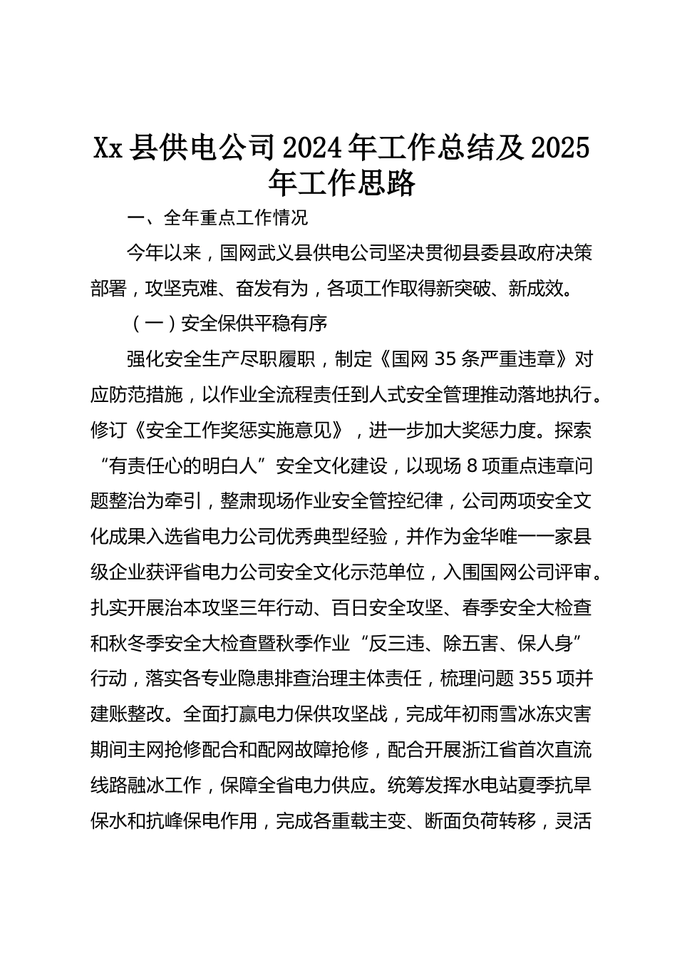 Xx縣供電公司2024年工作總結(jié)及2025年工作思路一、全年重點(diǎn)工作情況今年以來,國(guó)網(wǎng)武義縣供電公司堅(jiān)決貫徹縣委縣政府決策部署,攻堅(jiān)克難、奮發(fā)有為,各項(xiàng)工作取得新突破、新成效。(一)安全保供平穩(wěn)有序強(qiáng)化安全生產(chǎn)盡職履職,制定《國(guó)網(wǎng)35條嚴(yán)重違章》對(duì)應(yīng)防范措施,以作業(yè)全流程責(zé)任到人式安全管理推動(dòng)落地執(zhí)行。修訂《安全工作獎(jiǎng)懲實(shí)施意見》,進(jìn)一步加大獎(jiǎng)懲力度。探索“有責(zé)任心的明白人”安全文化建設(shè),以現(xiàn)場(chǎng)8項(xiàng)重點(diǎn)違章問題整治為牽引,整肅現(xiàn)場(chǎng)作業(yè)安全管控紀(jì)律,公司兩項(xiàng)安全文化成果入選省電力公司優(yōu)秀典型經(jīng)驗(yàn),并作為金華唯一一家縣級(jí)企業(yè)獲評(píng)省電力公司安...