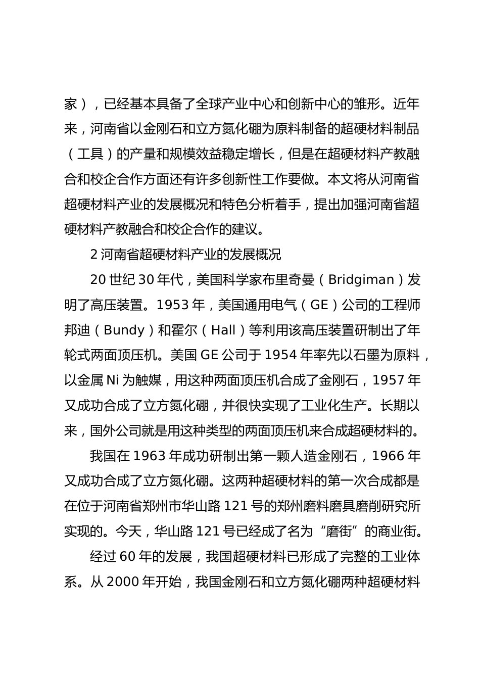 Xx省超硬材料產(chǎn)業(yè)現(xiàn)狀對產(chǎn)教融合和校企合作的分析1引言超硬材料屬于極端材料,性能極為特殊,尤其在高硬度方面是目前其他任何材料所不能代替的。立方氮化硼(CBN)和金剛石同屬于超硬材料。人們最先認知的超硬材料都是在天然礦石中發(fā)現(xiàn)的;后來開發(fā)了人工合成超硬材料技術(shù);到今天,作為超硬材料的一種,培育鉆石已經(jīng)在很大程度上替代了天然鉆石。工業(yè)生產(chǎn)應(yīng)用的超硬材料主要是金剛石和立方氮化硼。多年來,立方氮化硼的應(yīng)用領(lǐng)域有限,其產(chǎn)量遠低于金剛石。人造立方氮化硼的出現(xiàn)也晚于人造金剛石。以金剛石和立方氮化硼為主的超硬材料在河南省是有歷史基礎(chǔ)的,是既有明顯...