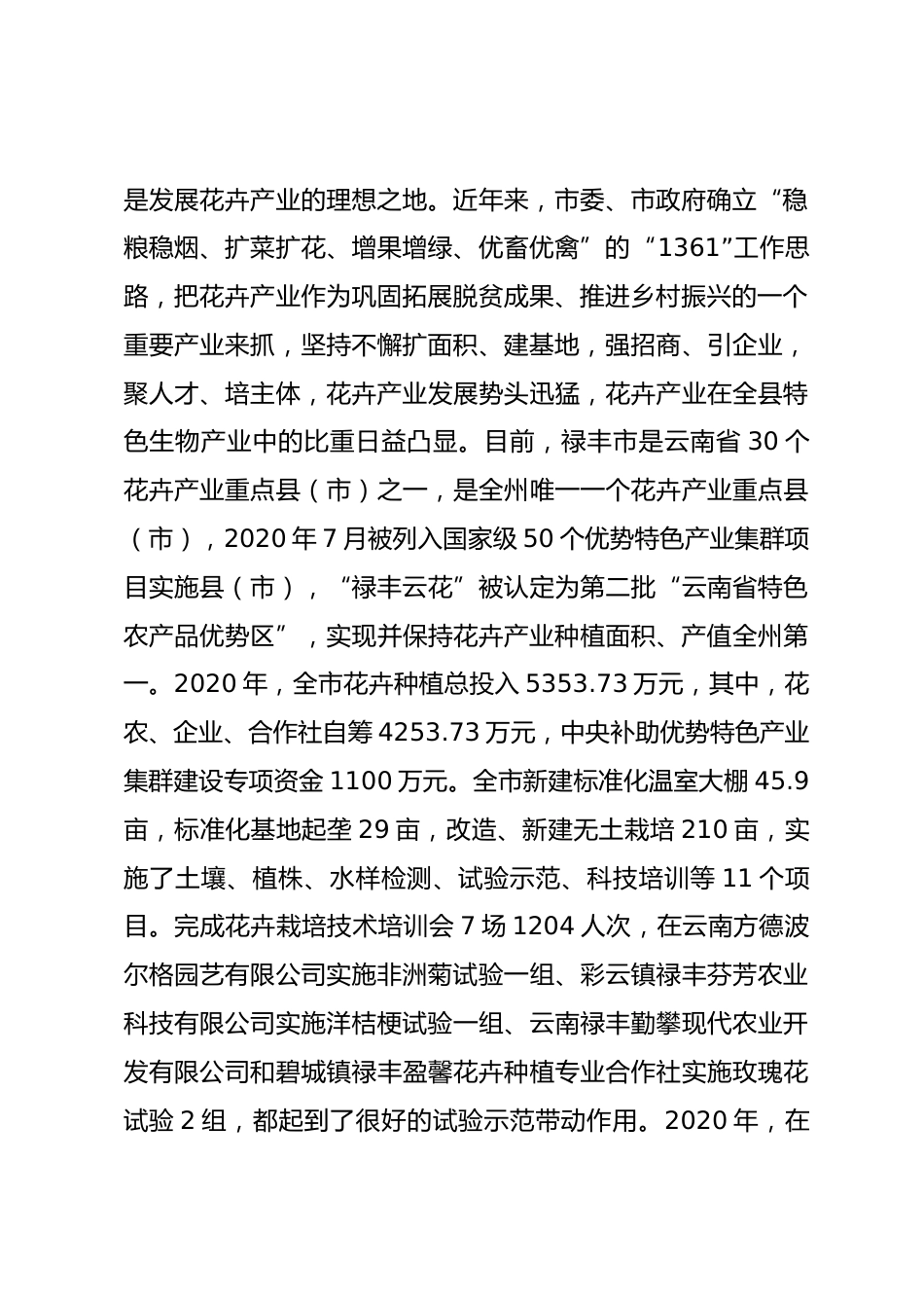 Xx市花卉產(chǎn)業(yè)發(fā)展調(diào)研報(bào)告中共祿豐市委政策研究室近年來(lái),世界花卉業(yè)以年平均25%的速度增長(zhǎng),遠(yuǎn)遠(yuǎn)超過(guò)世界經(jīng)濟(jì)發(fā)展的平均速度,被譽(yù)為“朝陽(yáng)產(chǎn)業(yè)”和“黃金產(chǎn)業(yè)”,是世界上最具活力的產(chǎn)業(yè)之一。云南的花卉產(chǎn)業(yè)已初步構(gòu)建了集科研、生產(chǎn)、加工、交易、運(yùn)輸和社會(huì)化配套服務(wù)為一體的全產(chǎn)業(yè)鏈體系,依托得天獨(dú)厚的自然優(yōu)勢(shì),在國(guó)家西部大開(kāi)發(fā)和“一帶一路”戰(zhàn)略的推動(dòng)下,取得了長(zhǎng)足的發(fā)展2019年,全省花卉種植總面積175.7萬(wàn)畝,花卉總產(chǎn)值751.7億元,其中,鮮切花種植面積25萬(wàn)畝,產(chǎn)量139.7億枝,均居全球第一。祿豐花卉產(chǎn)業(yè)屬后起之秀,是繼呈貢、玉溪、通海等地發(fā)展起來(lái)...