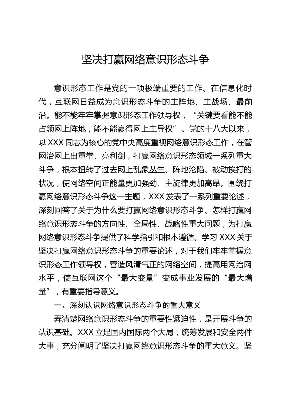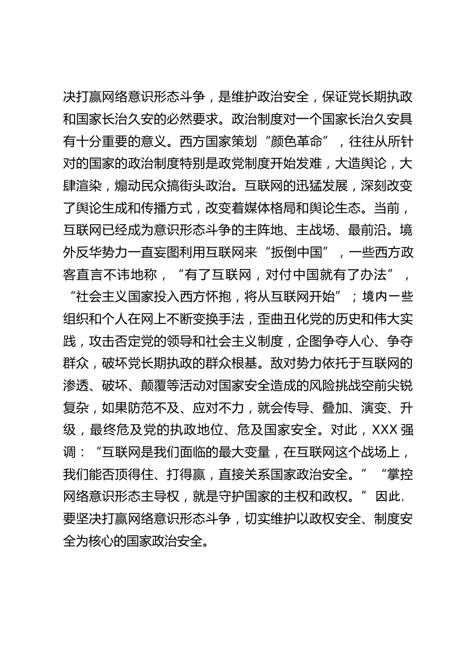 堅決打贏網(wǎng)絡意識形態(tài)斗爭意識形態(tài)工作是黨的一項極端重要的工作。在信息化時代,互聯(lián)網(wǎng)日益成為意識形態(tài)斗爭的主陣地、主戰(zhàn)場、最前沿。能不能牢牢掌握意識形態(tài)工作領導權(quán),“關鍵要看能不能占領網(wǎng)上陣地,能不能贏得網(wǎng)上主導權(quán)”。黨的十八大以來,以XXX同志為核心的黨中央高度重視網(wǎng)絡意識形態(tài)工作,在管網(wǎng)治網(wǎng)上出重拳、亮利劍,打贏網(wǎng)絡意識形態(tài)領域一系列重大斗爭,根本扭轉(zhuǎn)了過去網(wǎng)上亂象叢生、陣地淪陷、被動挨打的狀況,使網(wǎng)絡空間正能量更加強勁、主旋律更加高昂。圍繞打贏網(wǎng)絡意識形態(tài)斗爭這一主題,XXX發(fā)表了一系列重要論述,深刻回答了關于為什么要打贏網(wǎng)絡...