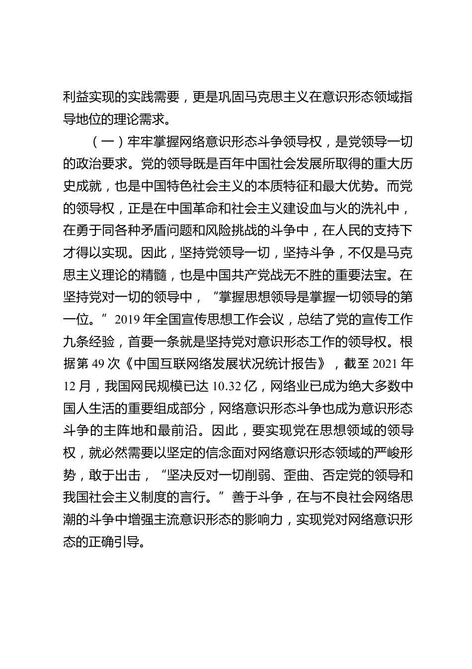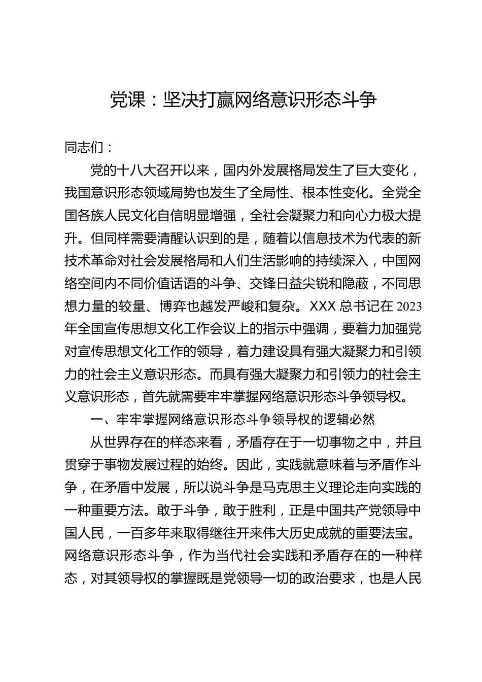 黨課:堅(jiān)決打贏網(wǎng)絡(luò)意識(shí)形態(tài)斗爭(zhēng)同志們:黨的十八大召開以來,國(guó)內(nèi)外發(fā)展格局發(fā)生了巨大變化,我國(guó)意識(shí)形態(tài)領(lǐng)域局勢(shì)也發(fā)生了全局性、根本性變化。全黨全國(guó)各族人民文化自信明顯增強(qiáng),全社會(huì)凝聚力和向心力極大提升。但同樣需要清醒認(rèn)識(shí)到的是,隨著以信息技術(shù)為代表的新技術(shù)革命對(duì)社會(huì)發(fā)展格局和人們生活影響的持續(xù)深入,中國(guó)網(wǎng)絡(luò)空間內(nèi)不同價(jià)值話語(yǔ)的斗爭(zhēng)、交鋒日益尖銳和隱蔽,不同思想力量的較量、博弈也越發(fā)嚴(yán)峻和復(fù)雜。XXX總書記在2023年全國(guó)宣傳思想文化工作會(huì)議上的指示中強(qiáng)調(diào),要著力加強(qiáng)黨對(duì)宣傳思想文化工作的領(lǐng)導(dǎo),著力建設(shè)具有強(qiáng)大凝聚力和引領(lǐng)力的社會(huì)主義...