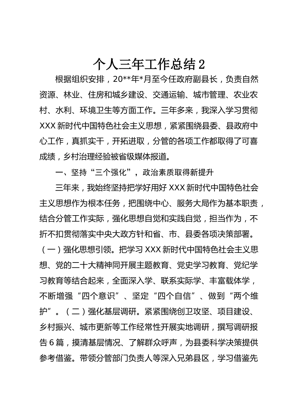 個(gè)人三年工作總結(jié)2根據(jù)組織安排,20**年*月至今任政府副縣長,負(fù)責(zé)自然資源、林業(yè)、住房和城鄉(xiāng)建設(shè)、交通運(yùn)輸、城市管理、農(nóng)業(yè)農(nóng)村、水利、環(huán)境衛(wèi)生等方面工作。三年多來,我深入學(xué)習(xí)貫徹XXX新時(shí)代中國特色社會(huì)主義思想,緊緊圍繞縣委、縣政府中心工作,真抓實(shí)干,開拓進(jìn)取,分管的各項(xiàng)工作都取得了可喜成績,鄉(xiāng)村治理經(jīng)驗(yàn)被省級媒體報(bào)道。一、堅(jiān)持“三個(gè)強(qiáng)化”,政治素質(zhì)取得新提升三年來,我始終堅(jiān)持把學(xué)好用好XXX新時(shí)代中國特色社會(huì)主義思想作為根本任務(wù),把圍繞中心、服務(wù)大局作為基本職責(zé),結(jié)合分管工作實(shí)際,強(qiáng)化思想自覺和實(shí)踐自覺,擔(dān)當(dāng)作為,不折不扣貫徹落實(shí)中...
