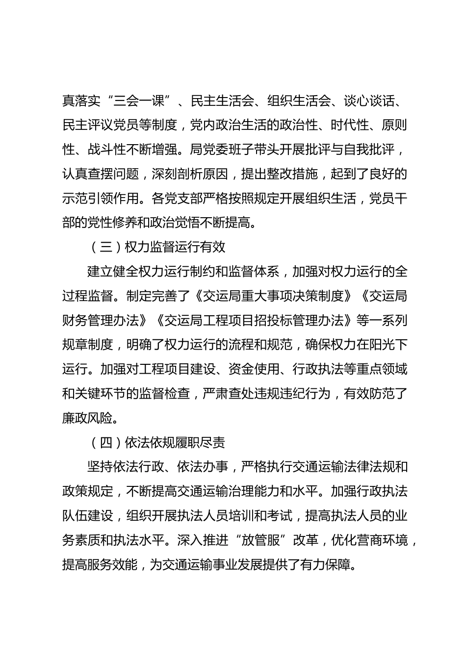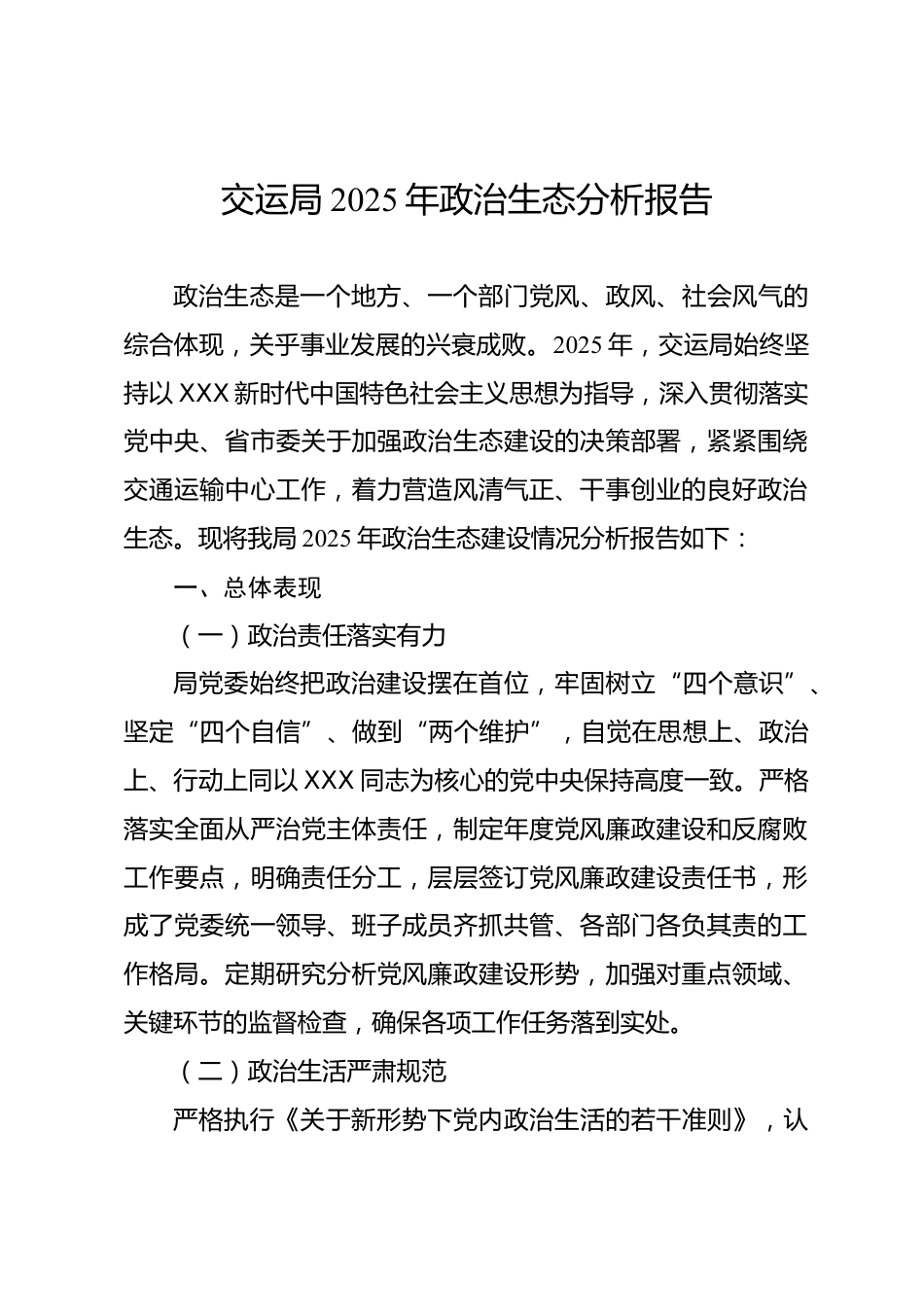 交運(yùn)局2025年政治生態(tài)分析報(bào)告政治生態(tài)是一個(gè)地方、一個(gè)部門(mén)黨風(fēng)、政風(fēng)、社會(huì)風(fēng)氣的綜合體現(xiàn),關(guān)乎事業(yè)發(fā)展的興衰成敗。2025年,交運(yùn)局始終堅(jiān)持以XXX新時(shí)代中國(guó)特色社會(huì)主義思想為指導(dǎo),深入貫徹落實(shí)黨中央、省市委關(guān)于加強(qiáng)政治生態(tài)建設(shè)的決策部署,緊緊圍繞交通運(yùn)輸中心工作,著力營(yíng)造風(fēng)清氣正、干事創(chuàng)業(yè)的良好政治生態(tài)?,F(xiàn)將我局2025年政治生態(tài)建設(shè)情況分析報(bào)告如下:一、總體表現(xiàn)(一)政治責(zé)任落實(shí)有力局黨委始終把政治建設(shè)擺在首位,牢固樹(shù)立“四個(gè)意識(shí)”、堅(jiān)定“四個(gè)自信”、做到“兩個(gè)維護(hù)”,自覺(jué)在思想上、政治上、行動(dòng)上同以XXX同志為核心的黨中央保持高度一致...