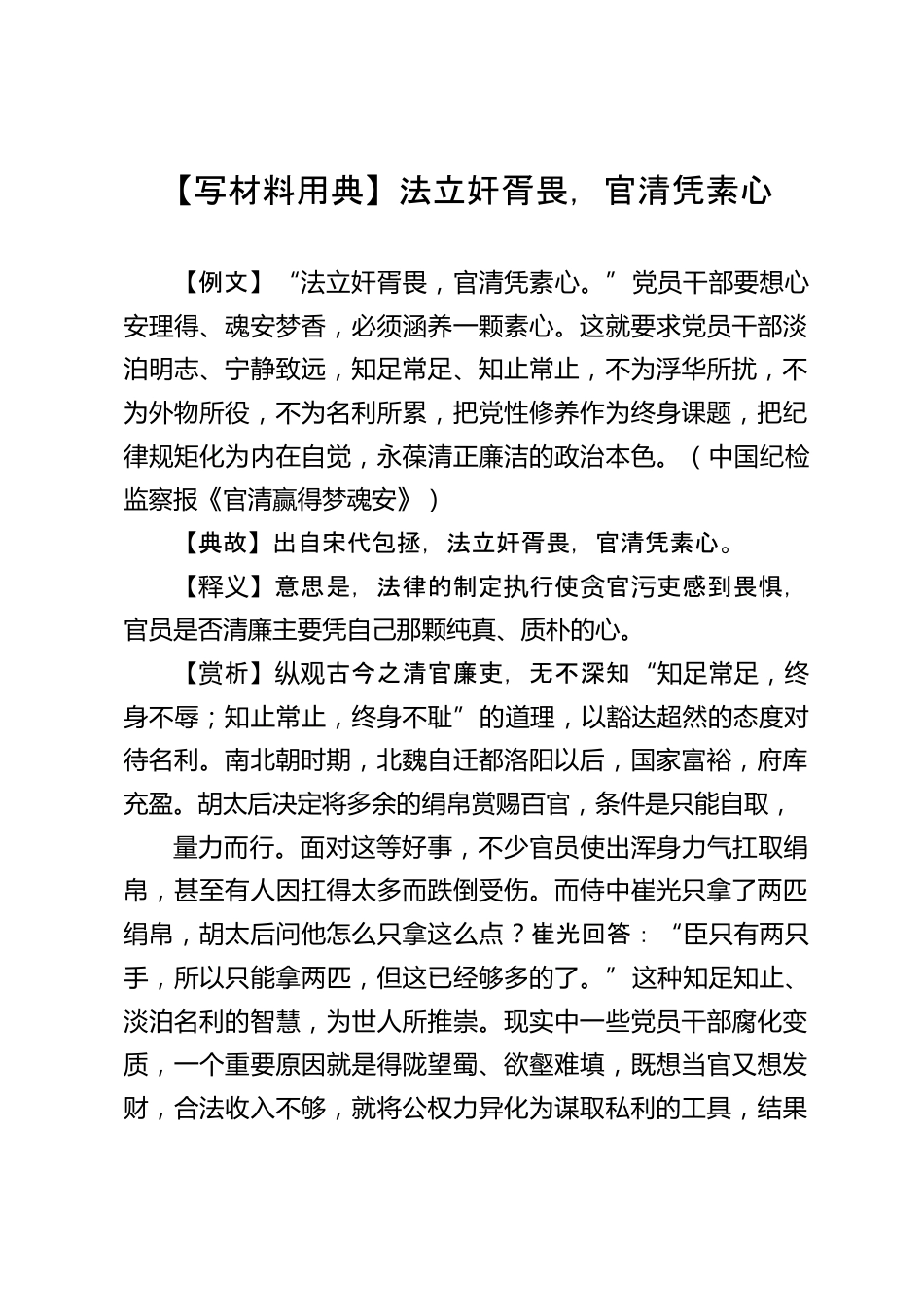 【寫材料用典】法立奸胥畏,官清憑素心【例文】“法立奸胥畏,官清憑素心。”黨員干部要想心安理得、魂安夢香,必須涵養(yǎng)一顆素心。這就要求黨員干部淡泊明志、寧靜致遠(yuǎn),知足常足、知止常止,不為浮華所擾,不為外物所役,不為名利所累,把黨性修養(yǎng)作為終身課題,把紀(jì)律規(guī)矩化為內(nèi)在自覺,永葆清正廉潔的政治本色。(中國紀(jì)檢監(jiān)察報《官清贏得夢魂安》)【典故】出自宋代包拯,法立奸胥畏,官清憑素心?!尽恳馑际牵傻闹贫ㄐ惺构倮舾械轿窇郑屃x執(zhí)貪污官員是否清廉主要憑自己那顆純真、質(zhì)樸的心?!疚觥抗沤裰骞倭?,無不深知賞縱觀“知足常足,終身不辱;知止常...