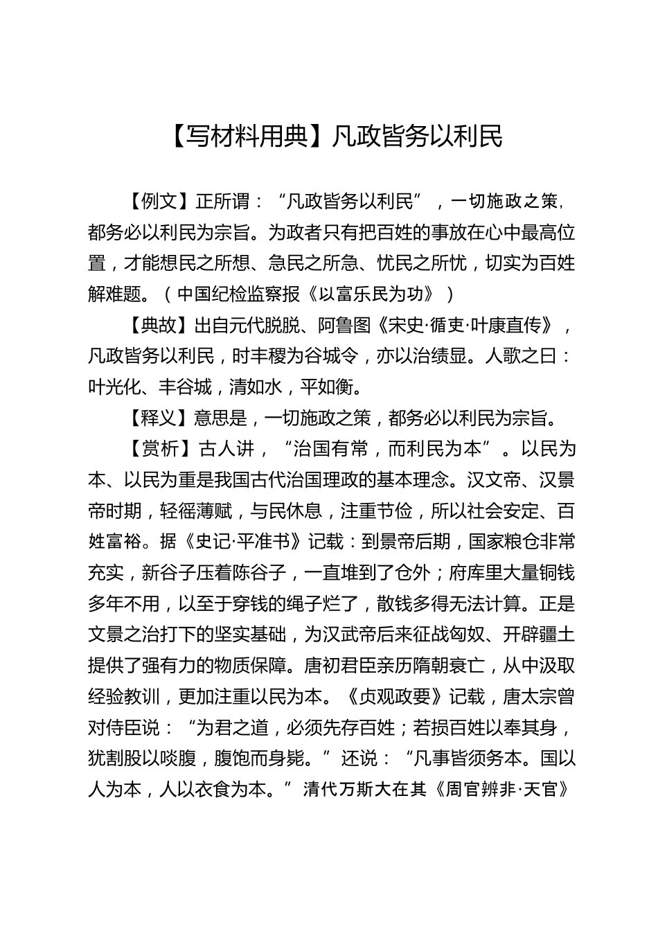 【寫材料用典】凡政皆務以利民【例文】正所謂:“凡政皆務以利民”,一切施政之策,都務必以利民為宗旨。為政者只有把百姓的事放在心中最高位置,才能想民之所想、急民之所急、憂民之所憂,切實為百姓解難題。(中國察《以富民功》紀檢監(jiān)報樂為)【典故】出自元代脫脫、阿魯圖《宋史·循吏·葉康直傳》,凡政皆務以利民,時豐稷為谷城令,亦以治績顯。人歌之曰:葉光化、豐谷城,清如水,平如衡。【釋義】意思是,一切施政之策,都務必以利民為宗旨?!举p析】古人講,“治國有常,而利民為本”。以民為本、以民為重是我國古代治國理政的基本理念。漢文帝、漢景帝時期,輕...
